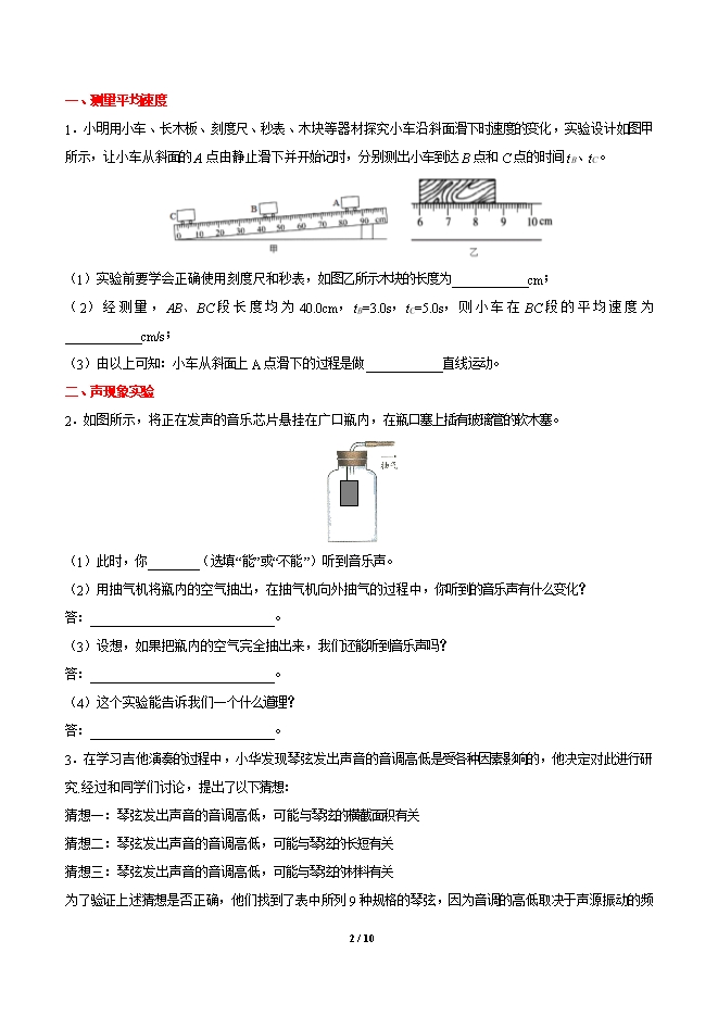 【内容简介】【知识补给】实验题型概述中考实验试题着重考查学生基本实验的知识、原理和基本实验技能。现在的中考实验题更加注重学生实验能力的检测,力图避免学生“背实验”和在黑板上做实验的倾向,出现了许多好的设计实验题。纵观各实验区的设计实验题,大都具有以下几个特点:一是跳出教材中学生实验和演示实验的束缚,不再是从学生实验和演示实验中挖掘、编制考题;二是要求学生自己独立设计实验方案,选择实验器材,制订实验步骤;三是试题具有开放性,设计方案的不唯一性给学生提供了很大的灵活运用知识、发挥能力的空间;四是考题着重考查学生灵活运用知识的能力,知识的迁移能力,以及实验能力,是对某一类相关知识和能力的全方位的考查。八年级上册涉及到的实验主要有,平均速度的测量、晶体的熔化和凝固、水的沸腾实验、光的反射、平面镜成像、光的折射、凸透镜成像的规律、质量和密度的测量,声现象相关的小实验等。方法点拨初中物理实验常用的探究方法有:控制变量法、转换法、等效法、类比法、推理法等。其中的控制变量法、转换法、等效法是考试命题中最多的三种,具体的做法和实验内容如下:(1)控制变量法:当一个物理量与多个物理因素有关时,为了研究这个物理量与其中某个因素的关系,先控制其他几个因素不变,改变这个因素,从而进行研究。例如探究声音的音调与什么因素有关实验就应用了此方法。(2)转换法:将不易观测的物理量转换成易于观察和测量的物理量来进行研究。根据乒乓球被弹开判断音叉在振动实验应用了转换法。(3)等效法:保证效果相同的前提下,将陌生复杂的问题用熟悉简单的物理量或物理过程来替代,得出同样结论的思维方法。探究平面镜成像的特点实验中运用了此方法。(4)类比法:由一类事物所具有的属性,推出与其类似的事物也具有这种属性的方法。(5)推理法:研究问题时,保留主要因素,忽略次要因素,从而简明扼要地揭示事物本质的方法。在探究探究真空能否传声实验中运用了此方法。【经典必练】一、测量平均速度1.小明用小车、长木板、刻度尺、秒表、木块等器材探究小车沿斜面滑下时速度的变化,实验设计如图甲所示,让小车从斜面的A点由静止滑下并开始记时,分别测出小车到达B点和C点的时间tB、tC。(1)实验前要学会正确使用刻度尺和秒表,如图乙所示木块的长度为____________cm;(2)经测量,AB、BC段长度均为40.0cm,tB=3.0s,tC=5.0s,则小车在BC段的平均速度为____________cm/s;(3)由以上可知:小车从斜面上A点滑下的过程是做____________直线运动。二、声现象实验