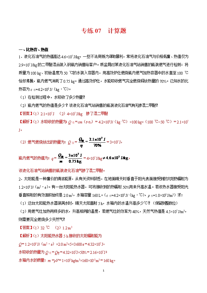 2019-2020学年上学期九年级物理期末考试考前必刷题:07 计算题(附答案解析)
