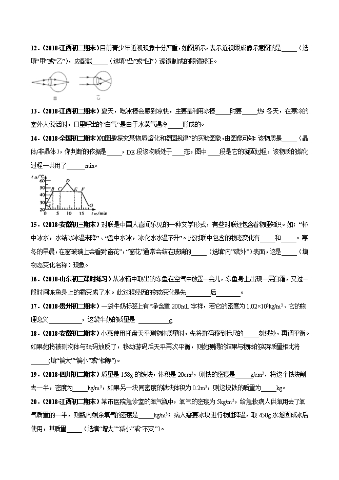 【内容简介】一、选择题(每小题3分,共30分)1.(2018·全国初二单元测试)将正在发声的手机、电铃或接通电源的音乐芯片悬挂在广口瓶内,如图所示,当把瓶内的空气抽出时,声音会逐渐变小,但始终能听到声音。原因是( )A.声源发声太强 B.瓶内已被抽成真空,真空亦能传声C.声源离广口瓶太近 D.瓶内仍有少量空气,悬挂声源的固体亦能传声2.(2019·吉林初二期末)暑假小明去北海公园游玩,站在清澈的湖边,望向平静的水面,看到“云在水中飘,鱼在云上游,鱼戏白塔绿树间”,在这些景象中距离水面最远的是( )A.白塔倒影 B.游动的鱼 C.水中白云 D.绿树倒影3.(2018·四川初二期末)关于热现象,下列说法不正确的是( )A.常用液体温度计是根据液体的热胀冷缩的性质工作的B.人们利用干冰(固态二氧化碳)进行人工降雨,是利用干冰升华放热C.游泳从河里上岸感觉冷是由于水蒸发吸热,风吹来觉得更冷是由于空气流动快加快了水的蒸发吸热D.气体打火机是通过压缩体积的方法把丁烷气体液化成液态储存在里面的4.(2018·全国初二课时练习)下列现象中属于液化的是( )A.雾凇的形成 B.河水成冰C.樟脑丸逐渐变小 D.露珠的形成5.(2018·甘肃初二期中)下面的几种现象中,属于汽化现象的是( )