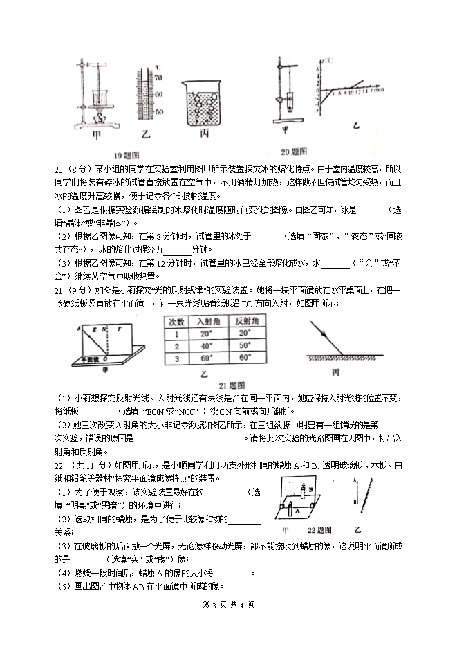 下载地址1|sj/2020/1/20201189647.doc<p><strong><span style="font-family:宋体">一、单项选择题(每小题</span>2</strong><strong><span style="font-family:宋体">分,共</span>20</strong><strong><span style="font-family:宋体">分)</span></strong></p><p>1.<span style="font-family:宋体">下列估测中,最接近实际的是(</span> <span style="font-family:宋体">)</span></p><p style="margin-left: 21px">A.<span style="font-family:宋体">中学生的身高约为</span>1.63dm B.<span style="font-family:宋体">洗澡水的温度约为</span>70℃</p><p style="margin-left: 21px">C.<span style="font-family:宋体">复兴号高铁运行时的速度约为</span>350m/s D.<span style="font-family:宋体">一个苹果的质最大约</span>200g</p><p>2.<span style="font-family:宋体">同学们与自己的老师们熟悉以后,在教室里通过听老师在走廊讲话的声音就能够判断出是哪位老师,这主要是根据下列什么来判断的(</span> <span style="font-family:宋体">)</span></p><p style="margin-left: 21px">A.<span style="font-family:宋体">音调</span> B.<span style="font-family:宋体">声波</span> C.<span style="font-family:宋体">音色</span> D.<span style="font-family:宋体">响度</span></p><p>3.<span style="font-family:宋体">小红站在商场上行的自动扶梯上,当我们说小红</span>“<span style="font-family:宋体">静止</span>”<span style="font-family: 宋体">时,所选的参照物是(</span> <span style="font-family:宋体">)</span></p><p style="margin-left: 21px">A.<span style="font-family:宋体">地面</span> B.<span style="font-family:宋体">自动扶梯</span> C.<span style="font-family:宋体">相邻下行扶梯上的阿姨</span> D.<span style="font-family:宋体">小红</span></p><p>4.<span style="font-family:宋体">下列现象中,由凝华形成的是(</span> <span style="font-family:宋体">)</span></p><p style="margin-left: 21px">A.<span style="font-family:宋体">初春,冰雪消融汇成溪流</span> B.<span style="font-family:宋体">盛夏,烈日炎炎河水千涸</span></p><p style="margin-left: 21px">C.<span style="font-family:宋体">深秋,清晨草地出现白箱</span> D.<span style="font-family:宋体">冬天,寒凤凛凛湖水成冰</span></p><p>5.<span style="font-family:宋体">一瓶矿泉水,被小明喝掉一半以后,密度会(</span> <span style="font-family:宋体">)</span></p><p style="margin-left: 21px">A.<span style="font-family:宋体">变大</span> B.<span style="font-family:宋体">变小</span> C.<span style="font-family:宋体">不变</span> D.<span style="font-family:宋体">都有可能</span></p><p>6.<span style="font-family:宋体">下列现象中,由于光的直线传播而形成的是(</span> <span style="font-family:宋体">)</span></p><p style="margin-left: 21px"><img width="480" height="76" src="http://www.czwlzx.com/UEditor/themes/default/images/spacer.gif" style="background:url(http://www.czwlzx.com/UEditor/lang/zh-cn/images/localimage.png) no-repeat center center;border:1px solid #ddd" /></p><p style="margin-left: 21px">A.<span style="font-family:宋体">海市蜃楼</span> B.<span style="font-family:宋体">月食</span> C.<span style="font-family:宋体">水中倒影</span> D.<span style="font-family:宋体">露珠成像</span></p><p>7.<span style="font-family:宋体">为了减小噪声带来的危害,在传播过程中减弱噪声的措施是(</span> <span style="font-family:宋体">)</span></p><p style="margin-left: 21px">A.<span style="font-family:宋体">安装噪声监控装置</span> B.<span style="font-family: 宋体">摩托车安装消音器</span></p><p style="margin-left: 21px">C.<span style="font-family:宋体">在校园周围植树</span> D.<span style="font-family: 宋体">工厂里的工人佩戴防噪声耳机</span></p><p><img width="134" height="99" src="http://www.czwlzx.com/UEditor/themes/default/images/spacer.gif" style="background:url(http://www.czwlzx.com/UEditor/lang/zh-cn/images/localimage.png) no-repeat center center;border:1px solid #ddd" />8.<span style="font-family:宋体">如图是甲乙两位同学的</span>s-t<span style="font-family:宋体">图像,以下说法正确的是(</span> <span style="font-family:宋体">)</span></p><p style="margin-left: 21px">A.<span style="font-family:宋体">甲乙两人都在做变速直线运动</span></p><p style="margin-left: 21px">B.<span style="font-family:宋体">路程为</span>60m<span style="font-family: 宋体">时甲乙二人相遇</span></p><p style="margin-left: 21px">C.<span style="font-family:宋体">乙的速度为</span>20m/s</p><p style="margin-left: 21px">D.<span style="font-family:宋体">甲比乙运动的快</span></p><p>9.<span style="font-family:宋体">暑假的时候小红去北湖游玩,见到一番美景便做了一首打油诗:</span>“<span style="font-family:宋体">北湖景色真是美,水映白塔与云朵,鱼游树与云朵间,天鹅也要入画卷。</span>”<span style="font-family:宋体">诗中所描述的这些景象中距离水面最远的是(</span> <span style="font-family:宋体">)</span></p><p style="margin-left: 21px">A.<span style="font-family:宋体">水中的白云</span> B.<span style="font-family:宋体">游动的鱼</span> C.<span style="font-family:宋体">绿树倒影</span> D.<span style="font-family:宋体">岸边的白塔</span></p><p>10.<span style="font-family:宋体">将一物体放在凸透镜前,使物距依次为</span>6cm<span style="font-family:宋体">、</span>18cm <span style="font-family: 宋体">和</span>24cm<span style="font-family:宋体">,分别得到放大的虚像、放大的实像和缩小的实像,则凸透镜的焦距</span>f<span style="font-family:宋体">满足关系式(</span> <span style="font-family:宋体">)</span></p><p style="margin-left: 21px">A.f<6 cm B.6cm < f < 18 cm C. 9 cm < f < 12 cm D. 18cm < f < 24 cm</p><p><br /></p>人教版吉林试题试卷免费doc