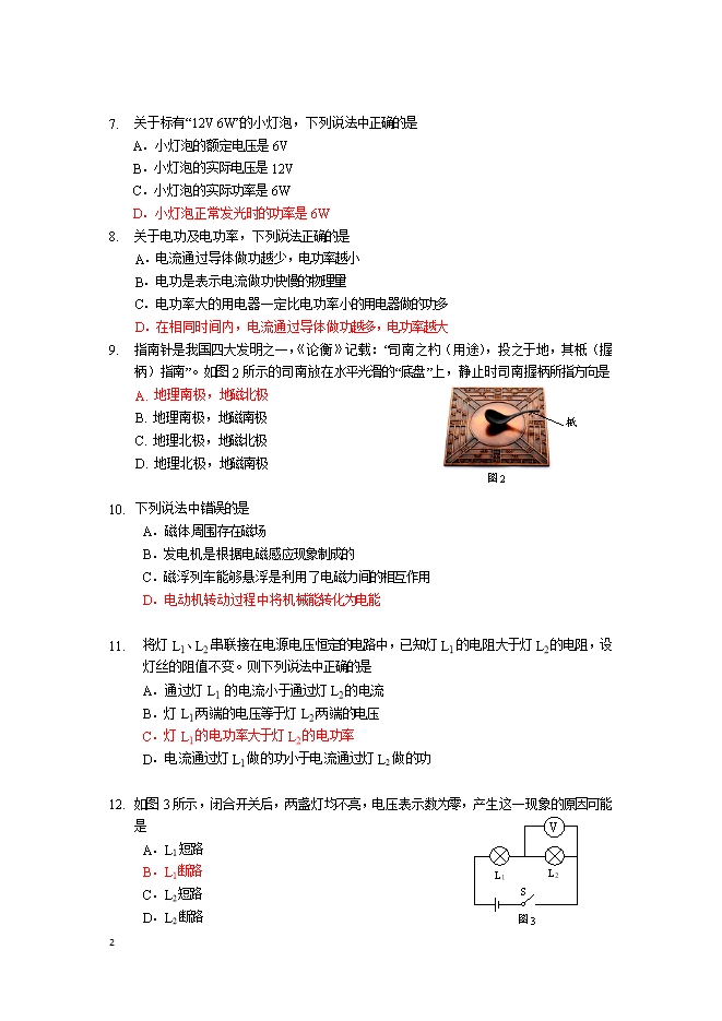【内容简介】一、单项选择题(下列各小题均有四个选项,其中只有一个选项符合题意。共30分,每小题2分)1. 2019年11月5日凌晨01时43分,我国成功发射第四十九颗北斗导航卫星。我国自行研制的北斗卫星导航系统具有定位、导航和通信等功能,它传递信息是利用A.电磁波 B.次声波 C.超声波 D.激光2. 下列用电器中,主要利用电流热效应工作的是A.电饭煲 B.电冰箱 C.电风扇 D.电视机3. 关于家庭电路,下列说法正确的是A.我国家庭电路的电压是110VB.家庭电路中电流过大时,空气开关会自动断开C.只有36V的电压对人体才是安全的D.家庭电路总电流过大,一定是电路中出现了短路4. 下列生活实例中不属于节约用电的是A.电视机不用时切断电源 B.离开教室随手关灯C.夏天用空调时把温度调得很低 D.尽量少开启电冰箱门5. 图1所示的磁体两极间磁感线的画法正确的是图1 6. 下列说法中正确的是 A. 磁感线是铁屑组成的 B. 可以通过铁屑来判断磁场中某点的磁场方向C. 磁场看不见摸不着,但可通过小磁针来感知它的存在 D. 小磁针的S极在某点所受磁场力的方向,跟该点磁感线的方向相同 7. 关于标有“12V 6W”的小灯泡,下列说法中正确的是A.小灯泡的额定电压是6VB.小灯泡的实际电压是12V C.小灯泡的实际功率是6WD.小灯泡正常发光时的功率是6W 8. 关于电功及电功率,下列说法正确的是 A.电流通过导体做功越少,电功率越小B.电功是表示电流做功快慢的物理量 C.电功率大的用电器一定比电功率小的用电器做的功多D.在相同时间内,电流通过导体做功越多,电功率越大9. 柢指南针是我国四大发明之一,《论衡》记载:“司南之杓(用途),投之于地,其柢(握柄)指南”。如图2所示的司南放在水平光滑的“底盘”上,静止时司南握柄所指方向是A. 地理南极,地磁北极B. 地理南极,地磁南极 C. 地理北极,地磁北极 D. 地理北极,地磁南极