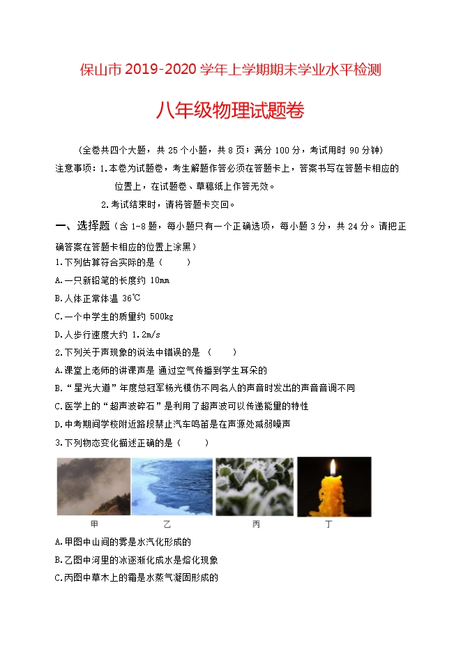 云南省保山市2019-2020学年八年级上学期期末学业水平检测物理试题及答案