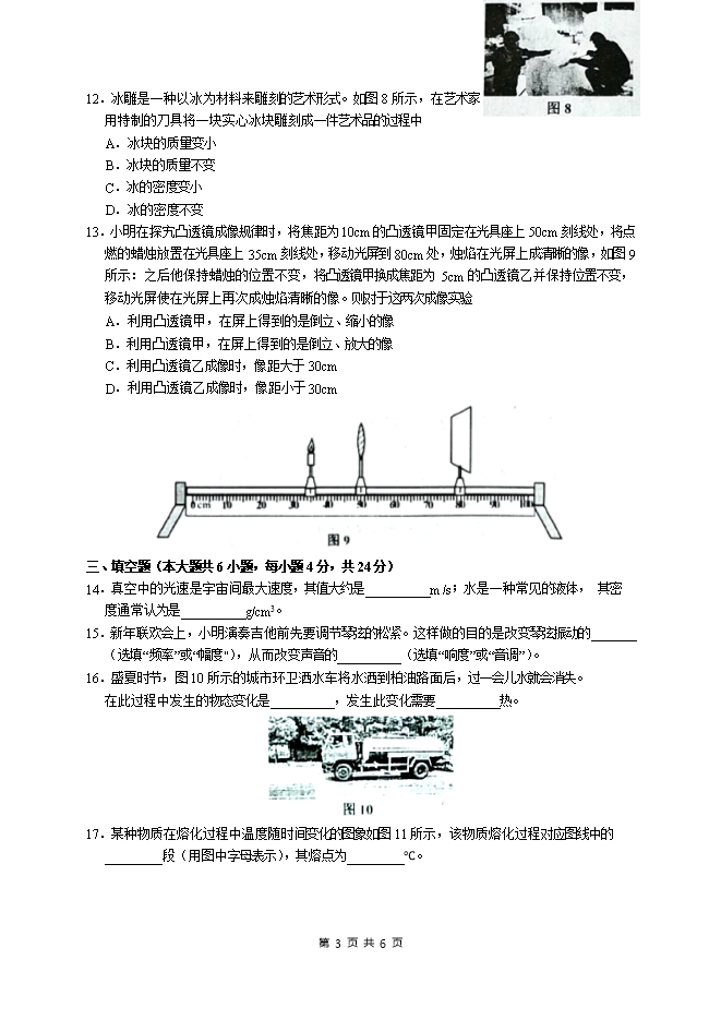 【内容简介】温馨提示:使用答题卡的区,学生作答时请将答案写在答题卡上;不使用答题卡的区,学生作答时请将答案写在试卷上。一、单项选择题(本大共10小题,每小3分,共30分。每小题的选项中只有一项最符合题意·选对的得3分,选错或不选的得0分。请把各小题最符合题意的选项序号填在下面的表格中)1.图1所示为庆祝新中国成立70周年阅兵式中,仪仗方队高擎党旗、国旗、军旗走正步经过天安门时的情景。队员们每一步行进的距离大约是A.75 mmB.75 cm C.75 dmD.75 m2.交通道路上常出现图2中所示的标志,其中是为了控制噪声的是 3.下列光学仪器或日常用品中,能够成与物体等大虚像的是A.穿衣镜 B.老花镜 C.显微镜 D.望远镜4.如图3所示,一束光斜射到平面镜上发生反射,其中z |:50。,则入射角及其大小是A.∠l,50°B.∠2,40°C.∠3,40°D.∠4,50°5.小明突然感觉自己所坐的校车在后退,其实校车并没有动。他有这种感觉是因为选择的参照物是A.校车旁边的路面 B.自己所坐的校车C.坐在身边的同学 D.旁边先行的校车6.在空中喷洒干冰是人工增雨的一种方法·干冰使空气中的水蒸气变成小冰粒,冰粒下降过程中变成雨滴、“水蒸气变成冰粒”、“冰粒变成雨滴”的物态变化过程分别属于A.凝华、熔化 B.凝华、液化C.升华、液化 D.升华、熔化7.如图4所示是一位视力缺陷者的眼球成像示意图,其所属视力类型及矫正视力需要配,戴的透镜是A.近视眼,凸透镜B.近视眼,凹透镜C.远视眼,凹透镜D.远视眼,凸透镜8.一束激光AO由空气斜射入平行玻璃砖的上表面,经两次折射后从玻璃砖的下表面射出·图5所示的四个折射光路图中,可能正确的是9.分别由甲、乙两种物质制成的不同物体,其质量与体积的关系如图6所示。分析图象可知,两种物质的密度之比ρ甲∶ρ乙为A.1∶2B.2∶1 C.4∶1 D.8∶110.人们认识事物,往往要对事物进行比较,从而引入相应的物理量。下列说法中错误的是A.为了比较物体的长短,引入“长度"的物理量B.为了比较物体的大小,引入“质量"的物理量C.为了比较物体运动快慢,引入“速度"的物理量D.为了比较物体冷热程度,引入“温度"的物理量