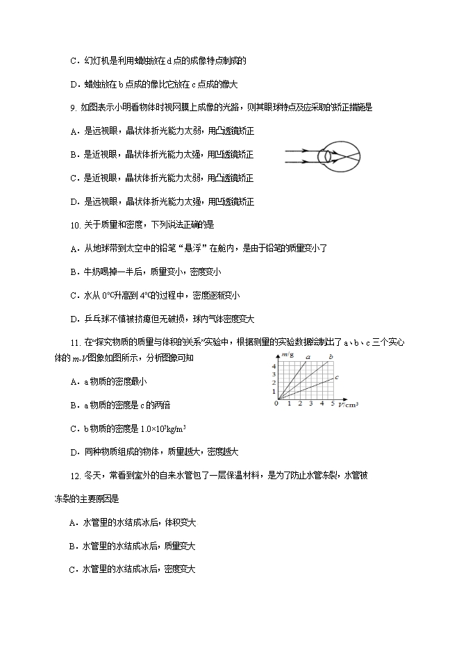 【内容简介】一、选择题(本题包括15个小题,每个小题只有一个正确选项,请将正确选项填在下方的答题框中)1. 如图是某住宅小区内的场景。下列说法不正确的是A.图中A是禁鸣标志,禁鸣是在声源处控制噪声B.图中B是汽车限速标志,它表示小区内限制车速不超过5m/sC.图中C是摄像头,它内部有光学元件,其作用相当于凸透镜D.进入小区的人和车通过摄像头成的是倒立缩小的实像2. 中华古诗词、俗语中蕴含着丰富的声学知识,下列有关理解正确的是A.“谁家玉笛暗飞声”中的笛声是由笛管的振动产生B.“响鼓还要重锤敲”说明声音的音调与振幅有关C.“闻其声而知其人”是根据声音的音色来辨别的D.“柴门闻犬吠,风雪夜归人”说明声音可以传递能量3. 下列设备与应用到的物理知识解释,其中不正确的是A.声呐---利用次声波测绘海底地形B.B超---利用超声波获得人体内部信息C.验钞器---紫外线使钞票上的荧光物质发光D.遥控器---靠红外线来实现对电视机的控制4. 如图所示的沙画是一种新型的艺术形式,它是通过将沙子洒落在平板灯台上,做出各种造型,灯台射出的光线由于受到沙子的阻挡,呈现出一幅栩栩如生的画面。下列光现象中与沙画的光学原理相同的是 5. 如图所示的广告图中有一处科学性的错误,它违背了光的某种规律,下面哪幅原理图能说明它违背的规律6. 下列有关光现象的说法中不正确的是A.雨后彩虹是光的色散现象B.红绿黄是色光的三原色C.透过蓝玻璃看红花,看到的花是黑色的D.红光照在穿白上衣、蓝裙子的演员身上,观众看到她上衣呈红色,裙子呈黑色7. 购物支付已进入“刷脸”时代,如图所示,消费者结账时只需面对摄像头(相当于一个凸透镜),经系统自动拍照、扫描等,确认相关信息后,即可迅速完成交易。下列有关说法正确的是A.光经过摄像头成像利用的是光的反射B.摄像头成像特点与投影仪相同C.“刷脸”时,面部应位于摄像头两倍焦距之外D.“刷脸”时,面部经摄像头成正立缩小的虚像