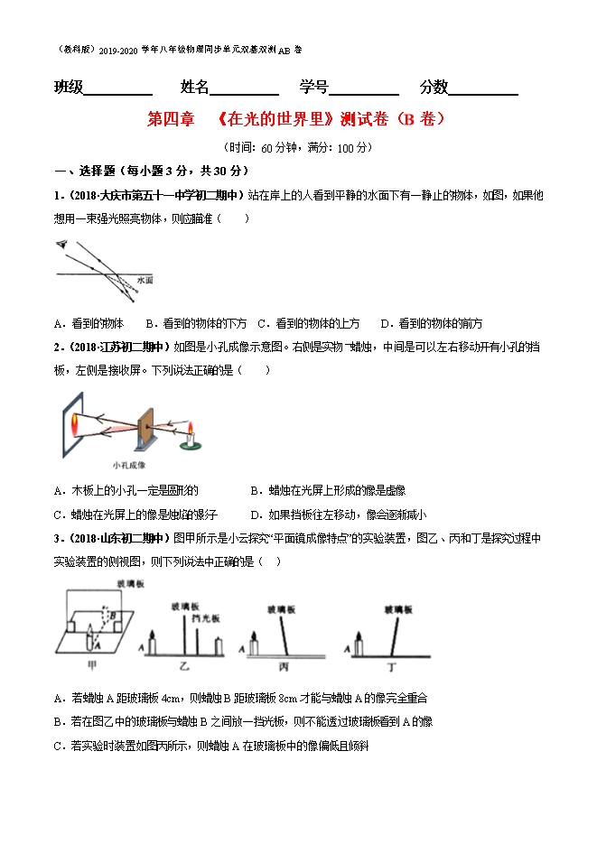 【内容简介】一、选择题(每小题3分,共30分)1.(2018·大庆市第五十一中学初二期中)站在岸上的人看到平静的水面下有一静止的物体,如图,如果他想用一束强光照亮物体,则应瞄准( )A.看到的物体 B.看到的物体的下方 C.看到的物体的上方 D.看到的物体的前方【答案】A【解析】水中物体反射出的光,在水面处发生了折射,折射光线向远离法线的方向偏折,我们看到的是变浅的物体的虚像,因此人要用激光手电筒的光束射中它,必须将手电筒对准他看到的物体,这样手电筒发出的激光经过折射才会照射在物体身上。故选A。2.(2018·江苏初二期中)如图是小孔成像示意图。右侧是实物﹣蜡烛,中间是可以左右移动开有小孔的挡板,左侧是接收屏。下列说法正确的是( )A.木板上的小孔一定是圆形的 B.蜡烛在光屏上形成的像是虚像C.蜡烛在光屏上的像是烛焰的影子 D.如果挡板往左移动,像会逐渐减小【答案】D【解析】A.小孔成像的原理是光的直线传播,小孔不一定是圆形的;故A错误;B.小孔所成的像是由实际光线汇聚而成的,是实像,故B错误;C.蜡烛在光屏上的像是实际光线汇聚而成的,故C错误;D.由图像可知当挡板往左移动时,汇聚在光屏上的像的大小会逐渐变小,故D正确。3.(2018·山东初二期中)图甲所示是小云探究“平面镜成像特点”的实验装置,图乙、丙和丁是探究过程中实验装置的侧视图,则下列说法中正确的是( )A.若蜡烛A距玻璃板4cm,则蜡烛B距玻璃板8cm才能与蜡烛A的像完全重合B.若在图乙中的玻璃板与蜡烛B之间放一挡光板,则不能透过玻璃板看到A的像C.若实验时装置如图丙所示,则蜡烛A在玻璃板中的像偏低且倾斜D.实验时装置如图丁所示,则蜡烛A在玻璃板中的像偏低且倾斜【答案】D【解析】A. 由平面镜成像特点可知,若蜡烛A距玻璃板4cm,蜡烛A的像距离平面镜也为4cm,则蜡烛B与玻璃板相距4cm才能与蜡烛A的像完全重合,故A错误;B. 平面镜成的是虚像,是光的反射形成的,因此,如果在玻璃板后面放一块挡光板,则能看见物体的像A′,无法看到物体B. 故B错误;CD、实验时平面镜必须要竖直放置,如果不竖直,不论怎样移动后面的蜡烛都不可能与前面蜡烛的像完全重合,由图可知,甲图平面镜竖直放置,不会出现像偏高的情况,丙和丁图平面镜没有竖直放置,分别作出蜡烛A的关于平面镜的对称点,可知,丙图蜡烛A在平板玻璃中蜡烛A的像偏高且倾斜,丁图蜡烛A在玻璃板中的像偏低且倾斜,如下图: