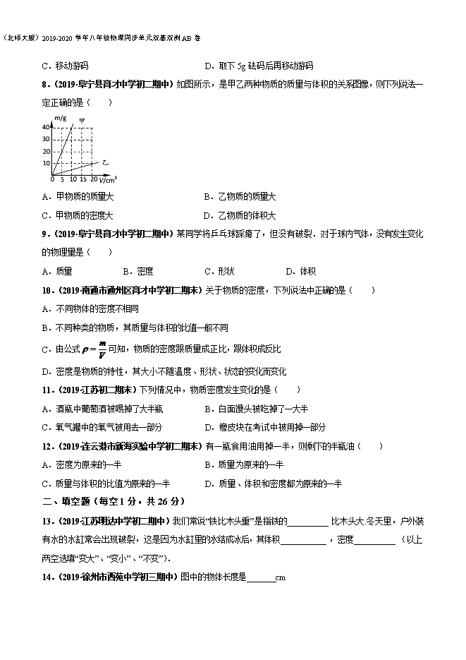 【内容简介】一、选择题(每小题2分,共24分)1.(2019·江苏明达中学初二期中)关于物体的质量和密度,下列说法正确的是( )A.把铁块加热,质量变大,密度变小B.航天员在太空处于失重状态,其质量和密度均为零C.一块萘熔化后,质量变小,密度不变D.把铜块碾成铜片,质量和密度均不变【答案】D【解析】A. 把铁块加热,铁块所含物质多少不变,即质量不变,但体积膨胀变大,由可知,其密度变小。故A错误。B. 航天员在太空处于失重状态,其所含物质多少不变,也具有一定的体积。由可知,其密度不为零。故B错误。C. 一块萘熔化后,其所含物质多少不变,质量不变,体积变大。由可知,其密度变小。故C错误。D. 把铜块碾成铜片,只是形状改变,质量和体积都不变。由可知,其密度不变。故D正确。2.(2019·北京市第一五九中学初二期中)关于图所示的各种物品的质量或长度的估测,最接近实际的是( )A.普通筷子的长度约为60cmB.通常过街天桥的高度约为30mC.小饭碗的质量约为3kgD.一袋小浣熊干脆面的质量约为50g【答案】D【解析】A.普通筷子的长度与物理课本的长度相差不多,在25cm左右,故A不符合实际;B.一层楼的高度在3m左右,通常过街天桥的高度与此差不多,在3m左右,故B不符合实际;C.一个鸡蛋的质量在50g左右,小饭碗的质量与此相差不多,在30g=0.03kg左右,故C不符合实际;D.一袋小浣熊干脆面的质量与一个鸡蛋的质量相差不多,约为50g,故D符合实际。3.(2019·江苏省无锡市天一实验学校初二期中)以下为某同学测定煤油密度的一些实验步骤,这些步骤中可省去的步骤是( )①用天平称出空矿泉水瓶的质量m0②在矿泉水瓶里装满水,用天平称出它们的总质量m1③用天平称出矿泉水瓶装满煤油后的总质量m2④用量筒测出矿泉水瓶里所盛煤油的体积V⑤计算煤油的密度A.① B.②或④ C.③ D.都不能省去【答案】B【解析】A、为测出一定体积下的质量,要根据矿泉水瓶的质量与煤油质量的和减去矿泉水瓶的质量,因此①不能省去,A错误;B、一定质量的煤油的体积可由量筒量出或根据水的质量与密度求出其体积,所以可省去②或④,所以B正确;C、要根据矿泉水瓶的质量与煤油质量的和减去矿泉水瓶的质量,因此③不能省去,C错误;D、由以上分析可得,D不正确。