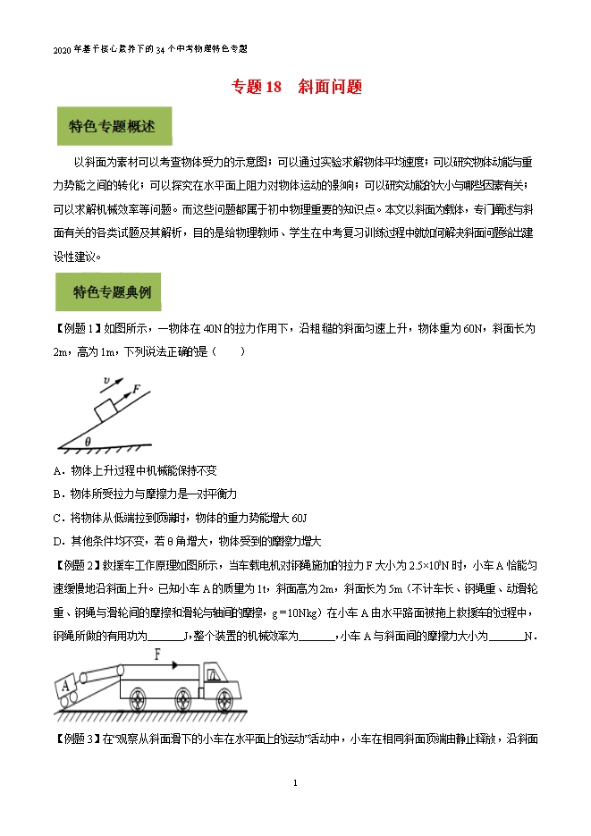 以斜面为素材可以考查物体受力的示意图;可以通过实验求解物体平均速度;可以研究物体动能与重力势能之间的以斜面为素材可以考查物体受力的示意图;可以通过实验求解物体平均速度;可以研究物体动能与重力势能之间的转化;可以探究在水平面上阻力对物体运动的影响;可以研究动能的大小与哪些因素有关;可以求解机械效率等问题。而这些问题都属于初中物理重要的知识点。本文以斜面为载体,专门阐述与斜面有关的各类试题及其解析,目的是给物理教师、学生在中考复习训练过程中就如何解决斜面问题给出建设性建议。【例题1】如图所示,一物体在40N的拉力作用下,沿粗糙的斜面匀速上升,物体重为60N,斜面长为2m,高为1m,下列说法正确的是( )A.物体上升过程中机械能保持不变B.物体所受拉力与摩擦力是一对平衡力C.将物体从低端拉到顶端时,物体的重力