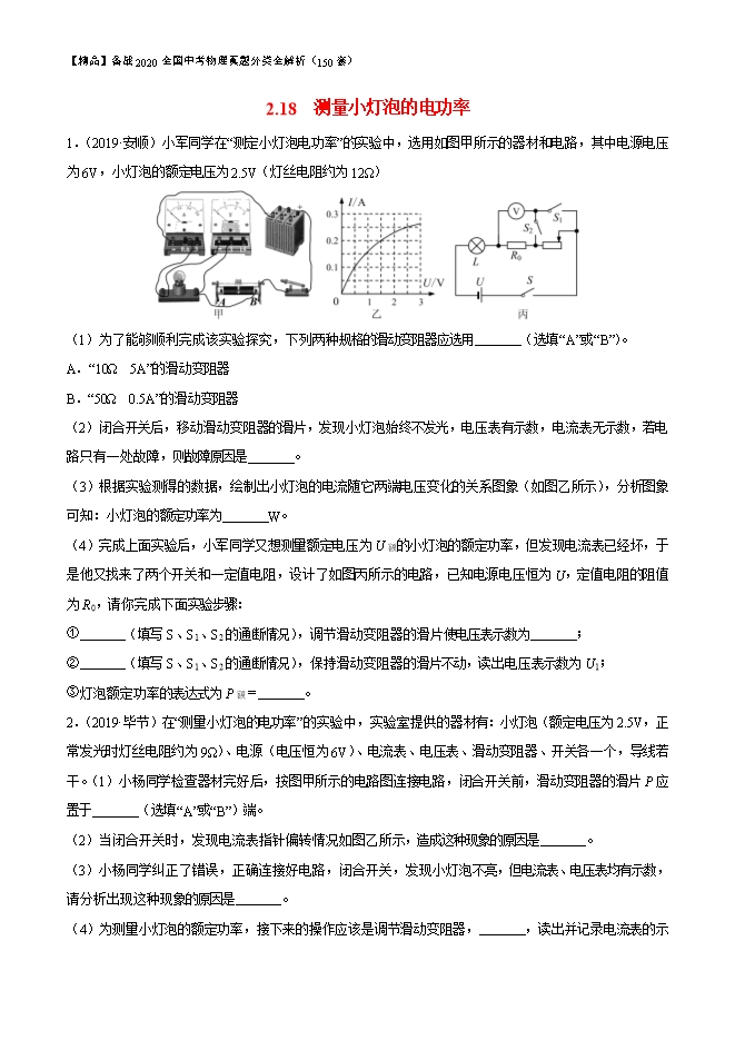【内容简介】1.(2019·安顺)小军同学在“测定小灯泡电功率”的实验中,选用如图甲所示的器材和电路,其中电源电压为6V,小灯泡的额定电压为2.5V(灯丝电阻约为12Ω)(1)为了能够顺利完成该实验探究,下列两种规格的滑动变阻器应选用 (选填“A”或“B”)。A.“10Ω 5A”的滑动变阻器B.“50Ω 0.5A”的滑动变阻器(2)闭合开关后,移动滑动变阻器的滑片,发现小灯泡始终不发光,电压表有示数,电流表无示数,若电路只有一处故障,则故障原因是 。(3)根据实验测得的数据,绘制出小灯泡的电流随它两端电压变化的关系图象(如图乙所示),分析图象可知:小灯泡的额定功率为 W。(4)完成上面实验后,小军同学又想测量额定电压为U额的小灯泡的额定功率,但发现电流表已经坏,于是他又找来了两个开关和一定值电阻,设计了如图丙所示的电路,已知电源电压恒为U,定值电阻的阻值为R0,请你完成下面实验步骤:① (填写S、S1、S2的通断情况),调节滑动变阻器的滑片使电压表示数为 ;② (填写S、S1、S2的通断情况),保持滑动变阻器的滑片不动,读出电压表示数为U1;③灯泡额定功率的表达式为P额= 。【答案】(1)B;(2)小灯泡断路;(3)0.625;(4)①闭合开关S、S1;U-U额;②闭合开关S、S2;③。【解析】解:(1)灯泡正常工作时电流为IL==≈0.2A.测定灯泡功率的实验中,灯泡与滑动变阻器串联,根据串联电路电压特点得,灯泡正常工作时,滑动变阻器两端电压为:U滑=U-UL=6V-2.5V=3.5V,由I=可得滑动变阻器电阻为:R滑===17.5Ω.滑动变阻器应选“50Ω 0.5A”的滑动变阻器,故选B;(2)闭合开关后,小灯泡不亮,可能是灯泡短路或电路存在断路造成的,电流表无示数,说明电路存在断路;电压表示数有示数,说明与电压表并联的灯泡断路;(3)根据图乙知,当电压为额定电压U=2.5V时,电流I=0.25A,小灯泡的额定功率为:P=UI=2.5V×0.25A=0.625W(4)分析实验的原理可以得出其具体的步骤为:①闭合开关S、S1,移动滑动变阻器的滑片,使电压表示数为U-U额;②闭合开关S、S2,保持滑动变阻器的滑片位置不变,读出电压表示数为U1;③通过灯泡的电流:I=IR0=,灯泡的额定功率的表达式为P额=U额I=U额×=。故答案为:(1)B;(2)小灯泡断路;(3)0.625;(4)①闭合开关S、S1;U-U额;②闭合开关S、S2;③。