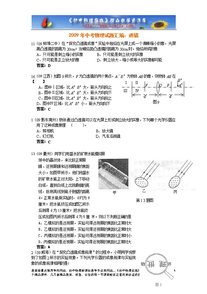 【内容简介】11(09蚌埠二中)在“探究凸透镜成像”实验中烛焰在光屏上成一个清晰缩小的像,光屏离凸透镜的距离为20cm;当蜡焰距凸透镜的距离为30cm时,烛焰所成的像