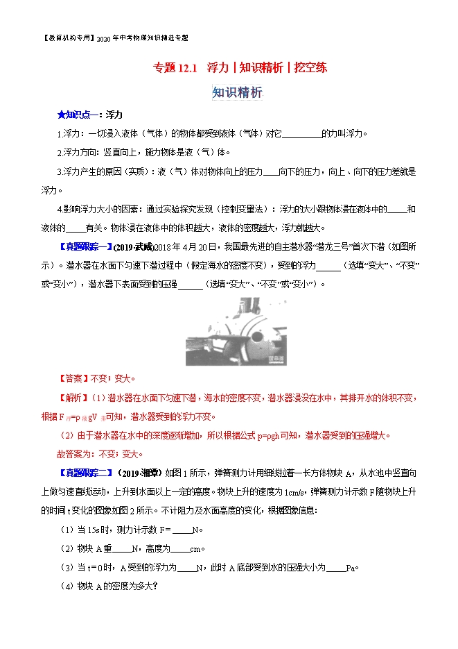 【教育机构专用】2020年中考物理知识精选专题:12.浮力(知识精析和挖空练 测练和作业)