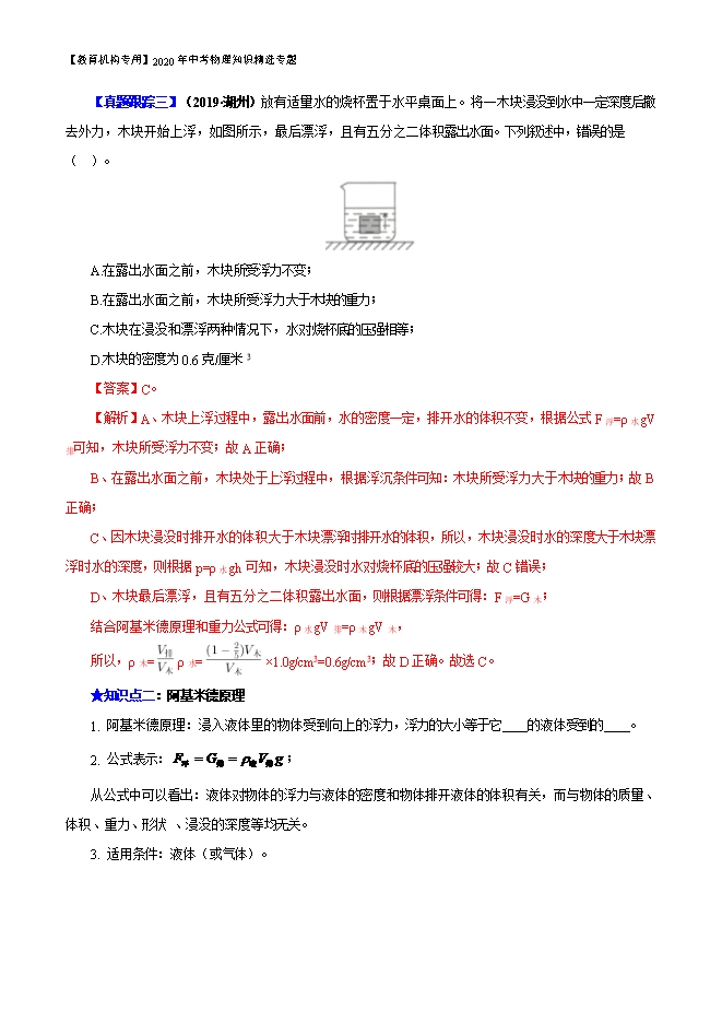 【内容简介】【真题跟踪三】(2019·湖州)放有适量水的烧杯置于水平桌面上。将一木块浸没到水中一定深度后撤去外力,木块开始上浮,如图所示,最后漂浮,且有五分之二体积露出水面。下列叙述中,错误的是( )。A.在露出水面之前,木块所受浮力不变;B.在露出水面之前,木块所受浮力大于木块的重力;C.木块在浸没和漂浮两种情况下,水对烧杯底的压强相等;D.木块的密度为0.6克/厘米3【答案】C。【解析】A、木块上浮过程中,露出水面前,水的密度一定,排开水的体积不变,根据公式F浮=ρ水gV排可知,木块所受浮力不变;故A正确;B、在露出水面之前,木块处于上浮过程中,根据浮沉条件可知:木块所受浮力大于木块的重力;故B正确;C、因木块浸没时排开水的体积大于木块漂浮时排开水的体积,所以,木块浸没时水的深度大于木块漂浮时水的深度,则根据p=ρ水gh可知,木块浸没时水对烧杯底的压强较大;故C错误;D、木块最后漂浮,且有五分之二体积露出水面,则根据漂浮条件可得:F浮=G木;结合阿基米德原理和重力公式可得:ρ水gV排=ρ木gV木,所以,ρ木=ρ水=×1.0g/cm3=0.6g/cm3;故D正确。故选C。★知识点二:阿基米德原理