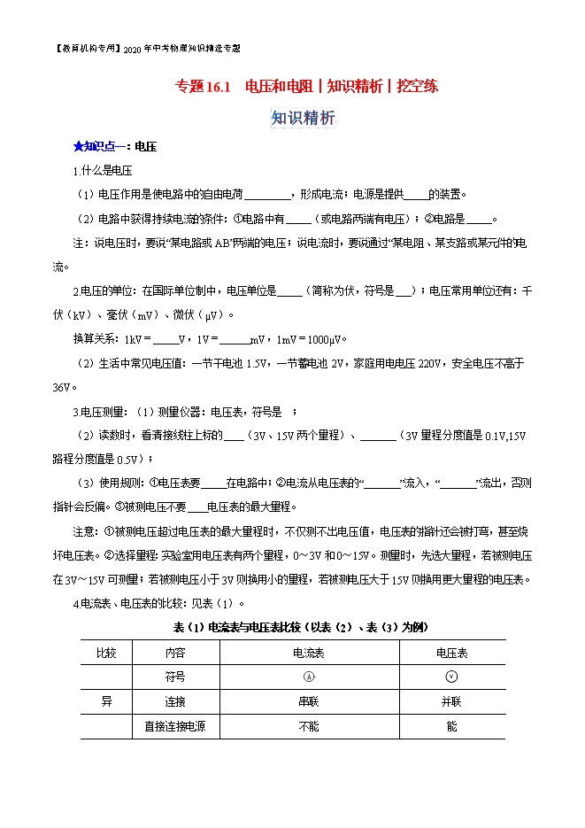 - 173【教育机构专用】2020年中考物理知识精选专题:16.电压和电阻(知识精析和挖空练 测练和作业)