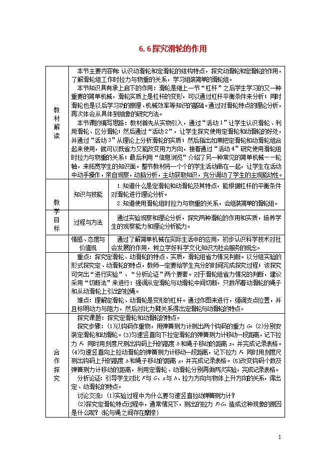 【内容简介】教材解读本节主要内容有:认识动滑轮和定滑轮的结构特点,探究动滑轮和定滑轮的作用,了解滑轮组工作时拉力与物重的关系,学习组装简单的滑轮组。本节知识具有承上启下的作用:滑轮是继上一节“杠杆”之后学生学习的又一种重要的简单机械,滑轮实质上是杠杆的变形,可以通过杠杆平衡条件来分析;同时滑轮也是以后学习功的原理、机械效率等知识的基础。通过对滑轮特点的理论分析,再次体会从具体到抽象的研究方法。本节课的编写思路:教材首先从实物引入,通过“活动1”让学生认识滑轮、利用滑轮、区分滑轮;然后通过“活动2”,让学生探究使用定滑轮和动滑轮的好处,并通过“活动3”从理论上分析滑轮的实质;然后指出如果把定滑轮和动滑轮组合起来使用,就可以既省力又能改变用力方向,接着通过“活动4”研究使用滑轮组时拉力与物重的关系;最后利用“信息浏览”介绍了另一种常见的简单机械——轮轴,来拓宽学生的知识面。整节教材将一个个的学生活动串在一起,让学生在活动中动手操作,亲自观察,动脑分析,主动获取知识,充分调动了学生的主观能动性。教学目标知识与技能 1.知道什么是定滑轮和动滑轮及其特点,能根据杠杆的平衡条件对滑轮进行理论分析。 2.知道使用滑轮组时拉力与物重的关系,会组装简单的滑轮组。过程与方法 通过实验观察和理论分析,探究两种滑轮的作用和实质,培养学生的观察能力和理论分析能力。情感、态度与价值观 通过了解简单机械在实际生活中的应用,初步认识科学技术对社会发展的作用,树立学好科学文化知识为社会服务的观念。重点:探究定滑轮、动滑轮的特点、实质,滑轮组省力情况判断。以分组实验的形式探究定、动滑轮的特点,教师一定要给学生充分的时间完成探究过程;该探究可突出“进行实验”、“分析论证”两个要素。对于滑轮组省力情况的判断,建议采用“切断法”来进行:强调从定滑轮与动滑轮中间切断,只数吊着动滑轮的绳子和从动滑轮上引出的拉绳。难点:理解定滑轮、动滑轮是变形的杠杆。通过作图来进行,强调支点位置,并且标明动力与阻力,然后对比力臂关系得出定滑轮与动滑轮的特点。