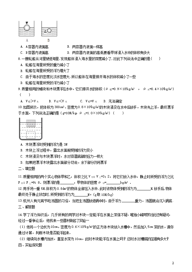 【内容简介】一、单选题 1.将一块实心物体放入盛水的烧杯中,物体静止时如图所示。若将该物体分成大小不同的两块,仍然放在盛水的烧杯中,则( )A. 大块沉入杯底,小块飘在水面上 B. 大块、小块都沉入杯底 C. 大块、小块都飘在水面上 D. 大块、小块都悬浮在水中 2.如图,小瓷碗漂浮在水面上,倾斜后能沉入水底,这一情景分析正确的是( ) A. 小瓷碗能沉入水底是因为它的重力变大了 B. 小瓷碗漂浮时受到的浮力小于它的重力 C. 小瓷碗浸没时和漂浮时相比所受的浮力变小了 D. 小瓷碗下沉过程中浮力大于重力3.通过改变浮力大小使物体上升的是( ) A. 向盛有清水的杯子中加入食盐,沉在杯底的鸡蛋逐渐上浮 B. 水舱排水,潜水艇从水底向水面升起 C. 点燃油脂后,孔明灯冉冉升起 D. 向浮筒内压入气体,沉船慢慢浮出水面4.中央军委主席习近平高度赞扬了海军372潜艇官兵.372潜艇在海上正常航行时,突然遭遇海水密度变化,引发潜艇“掉深”,即突然快速向海底沉降.指战员临危不惧,冷静处置,转危为安.造成潜艇沉降的原因可能是( ) A. 潜艇所受浮力突然增大 B. 潜艇所受压强突然增大 C. 潜艇所受浮力突然减小 D. 潜艇所受压强突然减小5.某种材料制成的空心球漂浮在甲液体的液面上,但沉于乙液体中.利用这个信息可得( ) A. 该材料的密度一定小于甲液体的密度 B. 该材料的密度一定大于乙液体的密度 C. 该材料的密度一定等于甲液体的密度 D. 该材料的密度一定等于乙液体的密度6.把体积为2dm3、重为12N的物体放入水中,若g取10N/kg,当它静止时所处的状态及受到的浮力大小分别是( )A. 漂浮,20N B. 漂浮,12N C. 沉底,20N D. 沉底,12N