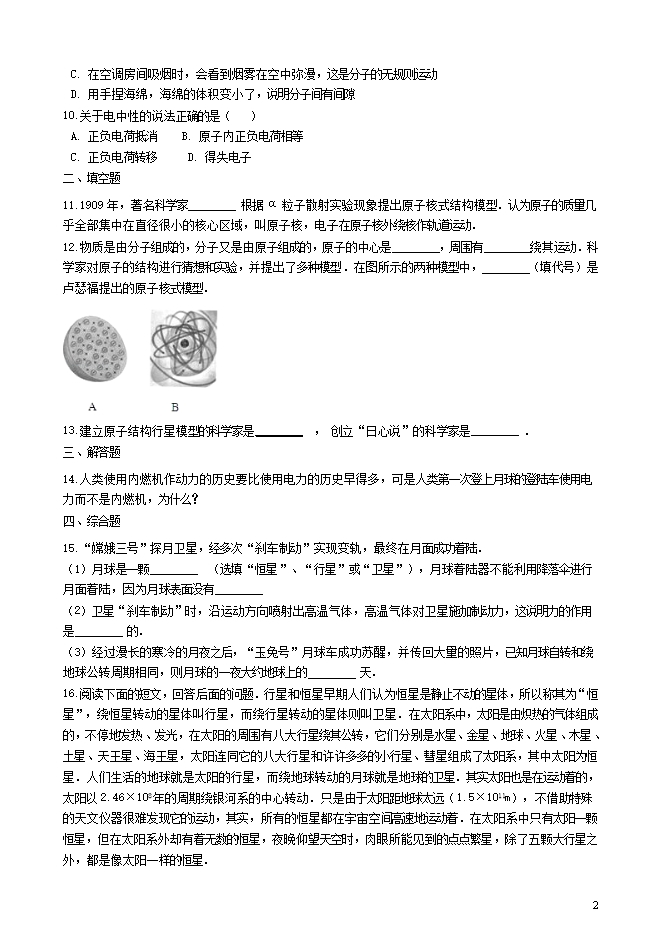【内容简介】15.“嫦娥三号”探月卫星,经多次“刹车制动”实现变轨,最终在月面成功着陆.(1)月球是一颗________ (选填“恒星”、“行星”或“卫星”),月球着陆器不能利用降落伞进行月面着陆,因为月球表面没有________ (2)卫星“刹车制动”时,沿运动方向喷射出高温气体,高温气体对卫星施加制动力,这说明力的作用是________ 的.(3)经过漫长的寒冷的月夜之后,“玉兔号”月球车成功苏醒,并传回大量的照片,已知月球自转和绕地球公转周期相同,则月球的一夜大约地球上的________ 天.16.阅读下面的短文,回答后面的问题.行星和恒星早期人们认为恒星是静止不动的星体,所以称其为“恒星”,绕恒星转动的星体叫行星,而绕行星转动的星体则叫卫星.在太阳系中,太阳是由炽热的气体组成的,不停地发热、发光,在太阳的周围有八大行星绕其公转,它们分别是水星、金星、地球、火星、木星、土星、天王星、海王星,太阳连同它的八大行星和许许多多的小行星、彗星组成了太阳系,其中太阳为恒星.人们生活的地球就是太阳的行星,而绕地球转动的月球就是地球的卫星.其实太阳也是在运动着的,太阳以2.46×108年的周期绕银河系的中心转动.只是由于太阳距地球太远(1.5×1011m),不借助特殊的天文仪器很难发现它的运动,其实,所有的恒星都在宇宙空间高速地运动着.在太阳系中只有太阳一颗恒星,但在太阳系外却有着无数的恒星,夜晚仰望天空时,肉眼所能见到的点点繁星,除了五颗大行星之外,都是像太阳一样的恒星.