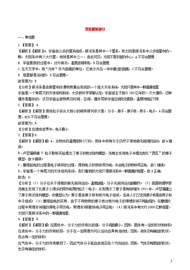 【内容简介】一、单选题 1.2018年3月14日,英国物理学家,现代最伟大的物理学家之一,被誉为“宇宙之王”的霍金逝世。关于宇宙,下列说法正确的是( ) A. 太阳是宇宙的中心 B. 宇宙膨胀的过程中,温度逐渐降低 C. 光年是速度的单位 D. 恒星都是静止不动的2.下列微粒按从大到小的顺序排列正确的是( ) A. 原子、原子核、质子、电子 B. 分子、电子、质子、原子 C. 原子核、电子、质子、分子 D. 分子、原子、电子、原子核3. 关于粒子和宇宙,下列说法正确的是( ) A. 温度为0℃,分子的无规则运动停止 B. 物理学家汤姆生建立了原子的核式结构模型 C. 摩擦起电的过程中,带正电的物体得到了质子 D. 宇宙是一个有层次的天体结构体系.太阳属于银河系中的一颗恒星4.下列物质中,分子间作用力最弱的是( )A. 铁块 B. 空气 C. 水 D. 水银5.地球的卫星是( )A. 太阳 B. 火星 C. 水星 D. 月球6.下列关于物质微观结构的说法中,正确的是( ) A. 物质的微观模型是可以看到的,所以分子是可以用人眼直接观察到的 B. 所有的物质从液态变成固态时体积都变小 C. 所有的物质从液态变成气态时体积都增大 D. 物质的状态变化时,体积发生变化,与物质分子的排列方式无关7.在下列几组物质中,常温下属于有一定体积但没有固定形状的是( ) A. 铜块、木块、煤油 B. 水、汽油、硫酸C. 玻璃、空气、酒精 D. 水、冰、水蒸气8.对下列微观粒子,按尺寸由大到小排列的正确顺序是 ( )A. 分子、原子核、质子 B. 原子核、分子、质子 C. 质子、原子核、分子 D. 分子、质子、原子核