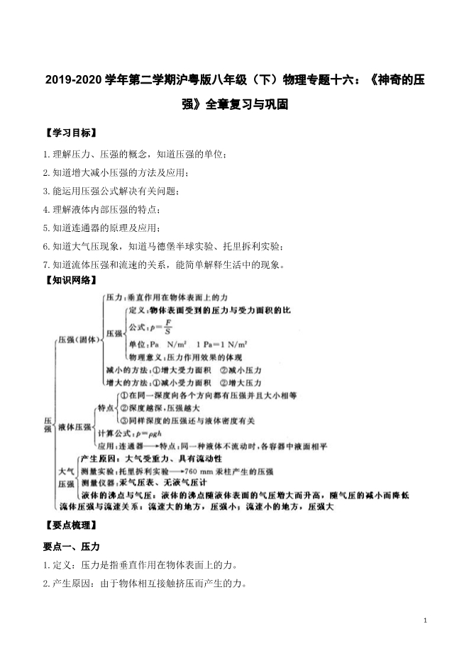 【内容简介】2019-2020学年第二学期沪粤版八年级物理(下)专题十六:《神奇的压强》全章复习与巩固知识点总结及习题精练(PDF详解版)