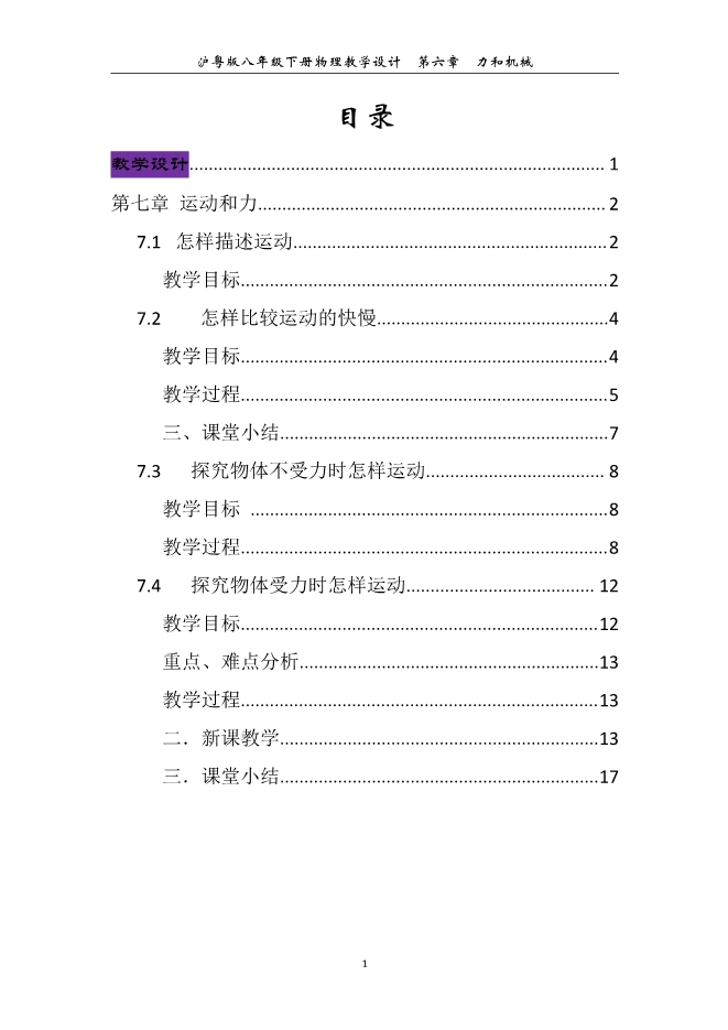 【内容简介】2019-2020学年沪粤版物理八年级下册第七章《运动和力》教学设计合集(PDF版)