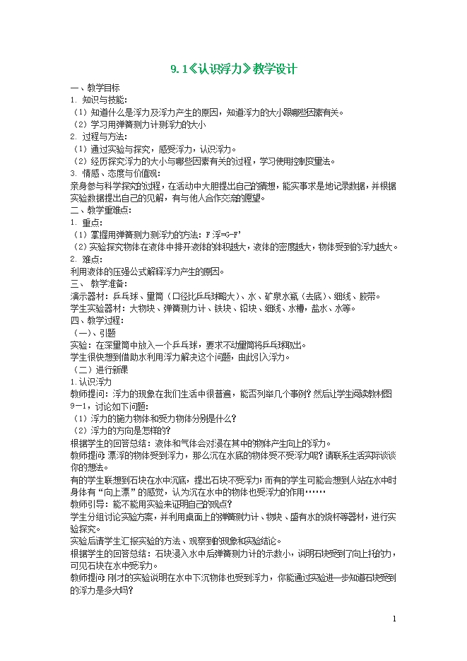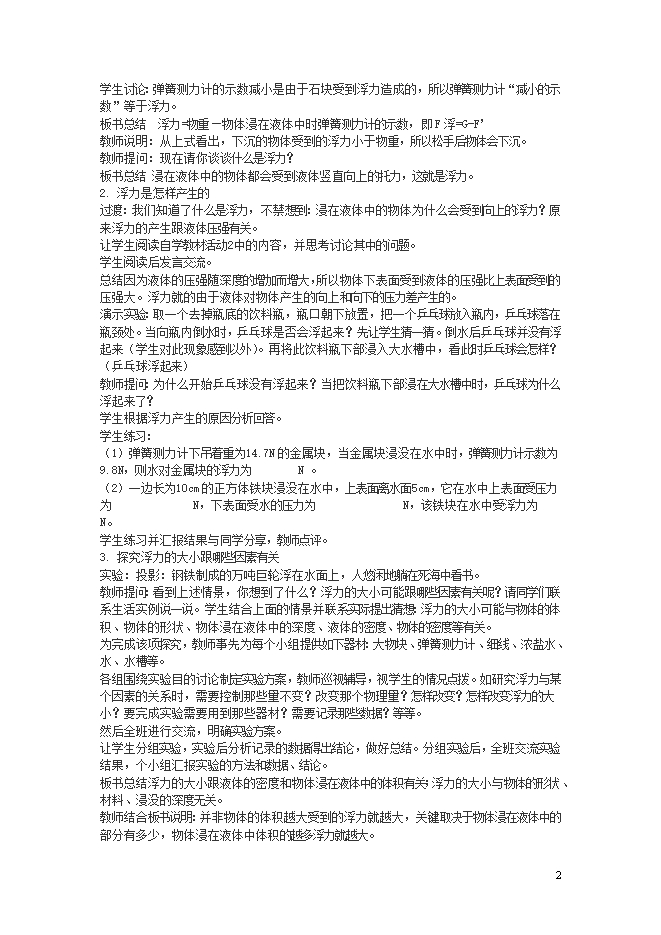 【内容简介】一、教学目标 1. 知识与技能: (1)知道什么是浮力及浮力产生的原因,知道浮力的大小跟哪些因素有关。 (2)学习用弹簧测力计测浮力的大小 2. 过程与方法: (1)通过实验与探究,感受浮力,认识浮力。 (2)经历探究浮力的大小与哪些因素有关的过程,学习使用控制变量法。 3. 情感、态度与价值观: 亲身参与科学探究的过程,在活动中大胆提出自己的猜想,能实事求是地记录数据,并根据实验数据提出自己的见解,有与他人合作交流的愿望。 二、教学重难点: 1. 重点: (1)掌握用弹簧测力测浮力的方法:F浮=G-F’ (2)实验探究物体在液体中排开液体的体积越大,液体的密度越大,物体受到的浮力越大。 2. 难点: 利用液体的压强公式解释浮力产生的原因。 三、 教学准备: 演示器材:乒乓球、量筒(口径比乒乓球略大)、水、矿泉水瓶(去底)、细线、胶带。 学生实验器材:大物块、弹簧测力计、铁块、铅块、细线、水槽,盐水、水等。 四、教学过程: (一)、引题 实验:在深量筒中放入一个乒乓球,要求不动量筒将乒乓球取出。 学生很快想到借助水利用浮力解决这个问题,由此引入浮力。 (二)进行新课 1.认识浮力 教师提问:浮力的现象在我们生活中很普遍,能否列举几个事例?然后让学生阅读教材图9—1,讨论如下问题: (1)浮力的施力物体和受力物体分别是什么? (2)浮力的方向是怎样的? 根据学生的回答总结:液体和气体会对浸在其中的物体产生向上的浮力。 教师提问:漂浮的物体受到浮力,那么沉在水底的物体受不受浮力呢?请联系生活实际谈谈你的想法。 有的学生联想到石块在水中沉底,提出石块不受浮力;而有的学生可能会想到人站在水中时身体有“向上漂”的感觉,认为沉在水中的物体也受浮力的作用•••••• 教师引导:能不能用实验来证明自己的观点? 学生分组讨论实验方案,并利用桌面上的弹簧测力计、物块、盛有水的烧杯等器材,进行实验探究。