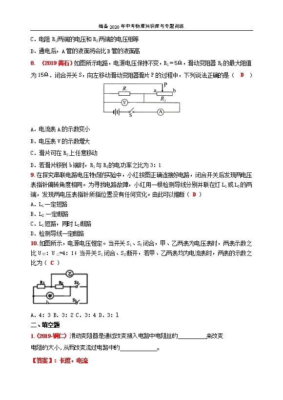 【内容简介】9.在探究串联电路电压特点的实验中,小红按图正确连接好电路,闭合开关后发现两电压表指针偏转角度相同。为寻找电路故障,小红用一根检测导线分别并联在灯L1或L2的两端,发现两电压表指针所指位置没有任何变化。由此可以推断( D )A.L1一定短路B.L2 一定断路C.L1短路,同时L2断路D.检测导线一定断路10.如图所示,电源电压恒定。当开关S1、S2闭合,甲、乙两表为电压表时,两表示数之比U甲:U乙=4:1;当开关S1闭合、S2断开,若甲、乙两表均为电流表时,两表的示数之比为( C ) A.4:3 B.3:2 C.3:4 D.3:l二、填空题1.(2019·铜仁) 滑动变阻器是通过改变接入电路中电阻丝的 来改变电阻的大小,从而改变流过电路中的 。【答案】:长度,电流