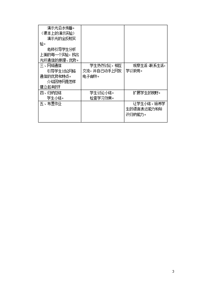 【内容简介】过师生共同交流来探讨现代信息的变化,用大量的多媒体图片、影视画面使学生掌握和了解卫星通信、光纤通信、网络通信的特点和粗略的原理。 情感、态度与价值观 通过学习现代通信知识,了解科技为人类带来的便利,提高学生学习科学的兴趣,使学生养成关注科学发展前沿的习惯,树立正确的科学观,培养振兴中华、用科学服务于人类的使命感和责任感。 重点与难点 卫星通信、光纤通信、网络通信的优点和原理。 教学准备 光纤小灯具、演示光在光导纤维中传播的装有水和有小孔的塑料瓶、不透光的纸、水、光的全反射演示仪器、微波通信、卫星通信影视图片、能上网的计算机一台(有条件的话让学生人手一台)。 教学过程