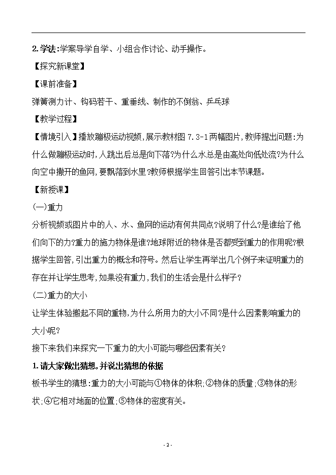 【内容简介】【情境引入】播放蹦极运动视频,展示教材图7.3-1两幅图片,教师提出问题:为什么做蹦极运动时,人跳出后总是向下落?为什么水总是由高处向低处流?为什么向空中撒开的鱼网,要飘落到水里?教师根据学生回答引出本节课题。【新授课】(一)重力分析视频或图片中的人、水、鱼网的运动有何共同点?说明了什么?是谁给了他们向下的力?重力的施力物体是谁?地球附近的物体是否都受到重力的作用呢?根据学生回答,引出重力的概念和符号。然后让学生再举出几个例子来证明重力的存在并让学生思考,如果没有重力,我们的生活会是什么样子?(二)重力的大小让学生体验搬起不同的重物,为什么所用力的大小不同?是什么因素影响重力的大小呢?
