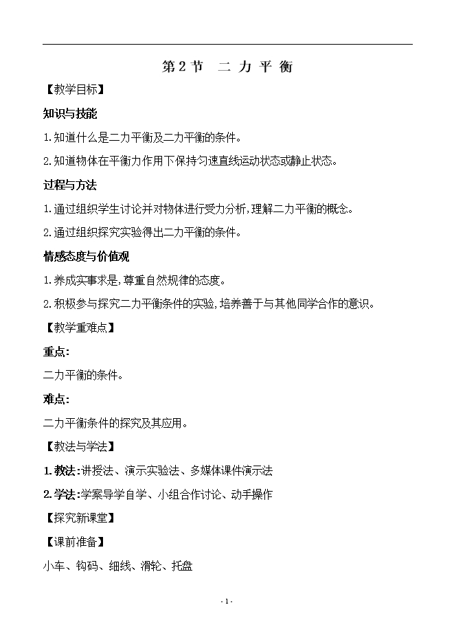 2019-2020人教版八年级物理下册教学设计:8.2二力平衡
