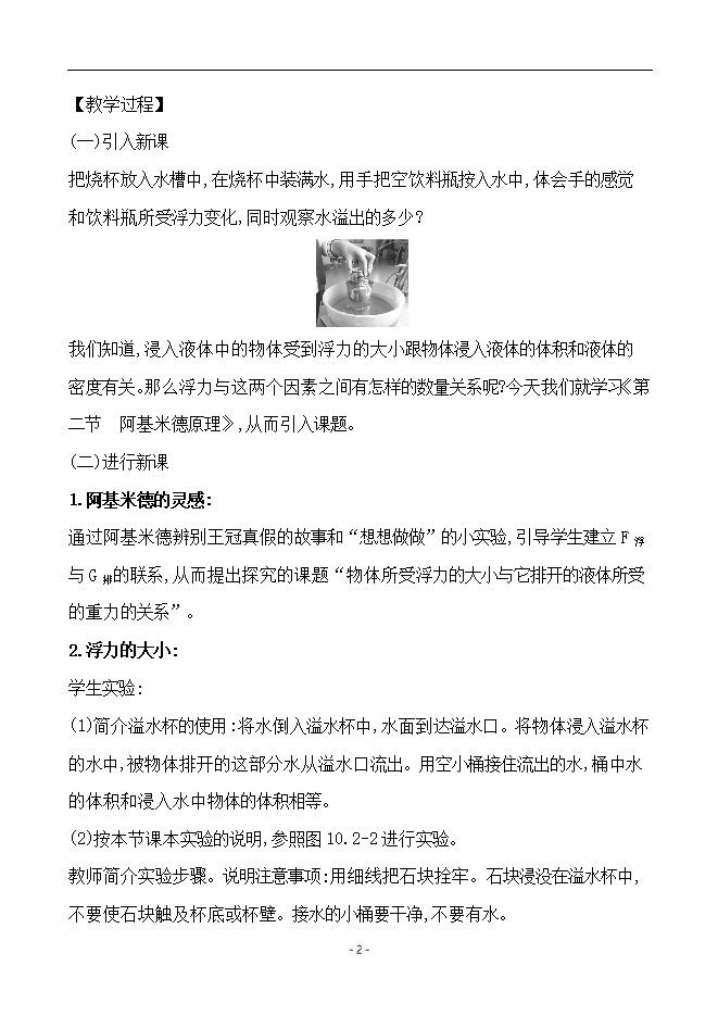 【内容简介】把烧杯放入水槽中,在烧杯中装满水,用手把空饮料瓶按入水中,体会手的感觉和饮料瓶所受浮力变化,同时观察水溢出的多少?我们知道,浸入液体中的物体受到浮力的大小跟物体浸入液体的体积和液体的密度有关。那么浮力与这两个因素之间有怎样的数量关系呢?今天我们就学习《第二节 阿基米德原理》,从而引入课题。(二)进行新课1.阿基米德的灵感:通过阿基米德辨别王冠真假的故事和“想想做做”的小实验,引导学生建立F浮与G排的联系,从而提出探究的课题“物体所受浮力的大小与它排开的液体所受的重力的关系”。2.浮力的大小:学生实验:(1)简介溢水杯的使用:将水倒入溢水杯中,水面到达溢水口。将物体浸入溢水杯的水中,被物体排开的这部分水从溢水口流出。用空小桶接住流出的水,桶中水的体积和浸入水中物体的体积相等。(2)按本节课本实验的说明,参照图10.2-2进行实验。教师简介实验步骤。说明注意事项:用细线把石块拴牢。石块浸没在溢水杯中,不要使石块触及杯底或杯壁。接水的小桶要干净,不要有水。