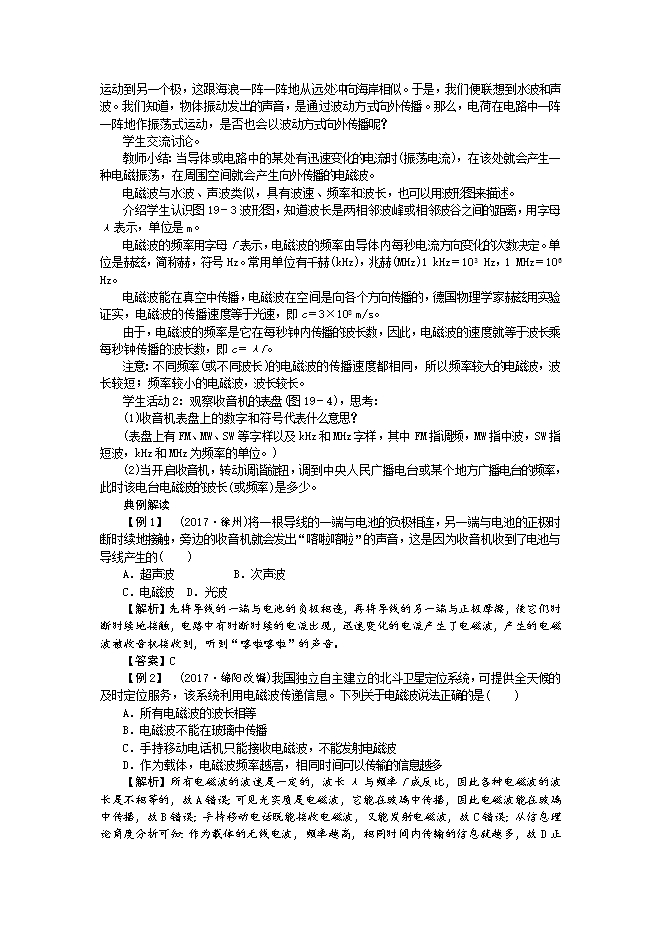 【内容简介】学生阅读教材P52页,了解不同时期人们传递信息的方式。学生展示,教师小结:古代人们使用烽火、信鸽、驿马等方式;现在人们使用手机、视频聊天、电子邮件等形式。当今这些信息传递都离不开电磁波,什么是电磁波?电磁波有哪些特点与应用就是我们本节课研究的重点。二、自主合作,感受新知阅读教材并结合生活实际,完成《探究在线·高效课堂》“预习导学”部分。三、师生互动,理解新知(一)认识电磁波观察教师演示实验活动1:体验电磁波。打开收音机,并调高音量,同时旋转调谐旋钮调到没有电台的位置。在收音机的附近,让电池的负极与一根导线的一端良好接触,导线的另一端在电池的另一极上快速断续接触,听收音机有什么反应。学生发现,收音机里发出“喀喀”声。 提问:为什么附近工作的收音机会发出“喀喀”声? 此时收音机接收到导线与电池间产生的电磁波。提问:什么是电磁波呢?在活动1中,由于导线通常是多根细铜丝组成,当多股细铜丝头在与电池的一个极断续接触时,一是因为接触的细铜丝头并非每次根根都能接触到,另一方面接触又是断断续续的。这样,电路中就会出现时有、时无、时大、时小的电流。我们又知道,电流是大量电荷在电路中定向运动形成的,这说明大量电荷在电池的电压作用下,是一阵一阵地从电池的一个极
