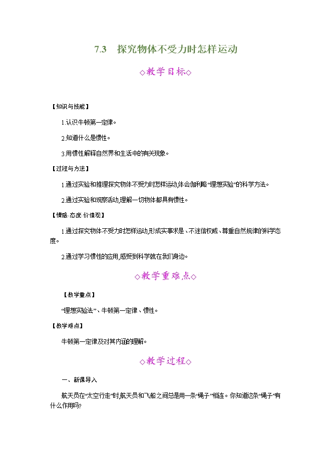 2020春沪粤版八年级物理下册《7.3探究物体不受力时怎样运动》教学设计