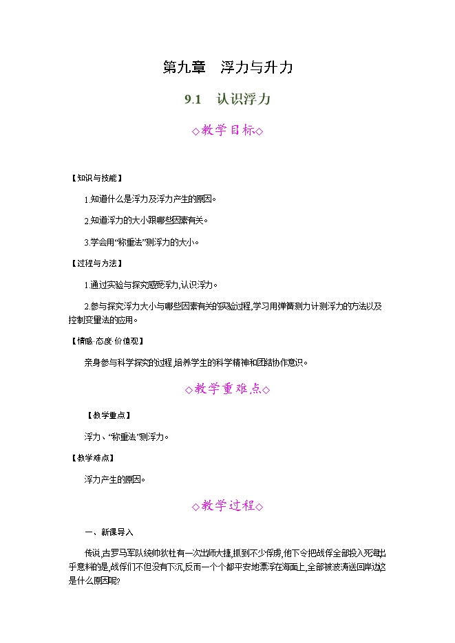 【内容简介】传说,古罗马军队统帅狄杜有一次出师大捷,抓到不少俘虏,他下令把战俘全部投入死海,出乎意料的是,战俘们不但没有下沉,反而一个个都平安地漂浮在海面上,全部被波涛送回岸边,这是什么原因呢? 二、教学步骤探究点1 什么是浮力[阅读课本]P85“什么是浮力”[思考]把一铁块挂在弹簧测力计下,然后用手将铁块轻轻托起,弹簧测力计的示数会怎样变化?为什么会这样变化?[提示]由于铁块受到向上的托力,测力计的示数变小。[思考]把一铁块挂在弹簧测力计下,然后轻轻放入水中,观察弹簧测力计的示数如何变化?为什么会这样变化?[提示]弹簧测力计的示数变小,说明水对铁块也有一个向上的托力。[思考]观察图9—1(a)(b),人与钢铁巨轮为什么能浮在水面上?[提示]浸在水中的物体受到水向上的托力。[思考]观察图9—1(c),热气球为什么能腾空而起?[提示]在气体中的物体受到气体向上的托力。[归纳提升]浸在液体(或气体)中的物体会受到液体(或气体)竖直向上的托力,这个托力就叫做浮力。[思考]把一铁块挂在弹簧测力计下,铁块受到了哪几个力的作用?这几个力有什么关系?[提示]铁块受到了重力G,还有弹簧测力计对铁块的拉力F;当铁块静止时,根据二力平衡可得F=G。.......