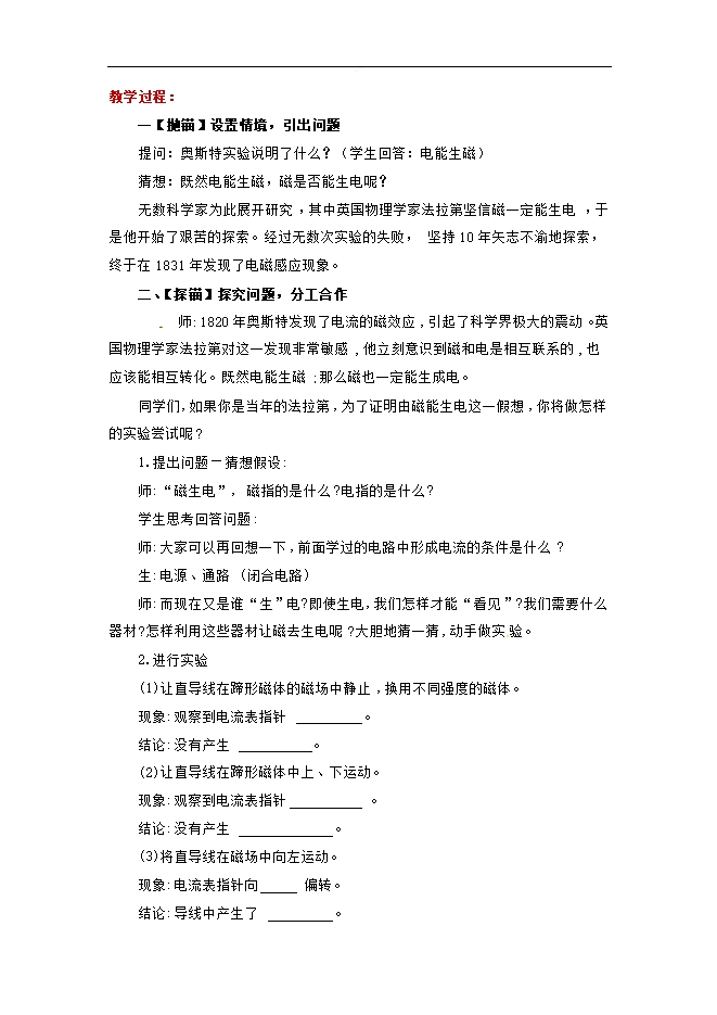【内容简介】 本节内容揭示了磁和电的内在联系,通过探究实验的方法归纳出了“磁生电”的规律,在设计学生探究实验,对现象进行分析归纳,最后总结出产生感应电流的条件,这样的编排符合学生的认知规律。教材中对电磁感应现象的应用也做了详细介绍。教学目标:【知识与能力目标】1.知道导体在磁场中运动时产生感应电流的条件。2.了解动圈式话筒的构造和原理。3.知道发电机的构造和原理。4.知道交流电及我国照明电路交流电的频率,能区分交流和直流电。【过程与方法目标】1.体会科学探索的过程特征,领悟科学思维方法。2.经历科学探究的过程,归纳概括出利用磁场产生电流的条件,培养培养学生逆向思维能力、学生的观察、操作、探究、概括能力以及交流与合作意识。【情感态度价值观目标】 通过本节课的学习,激发学生的求知欲望,培养他们严谨的科学态度。教学重难点:【教学重点】1.学生实验探究的过程。2.对产生感应电流条件的归纳总结。【教学难点】 1.教师对学生探究式学习的操控。2.学生对实验现象的分析总结。课前准备:1.教师研读课标、教材,撰写教学设计,制作多媒体课件。