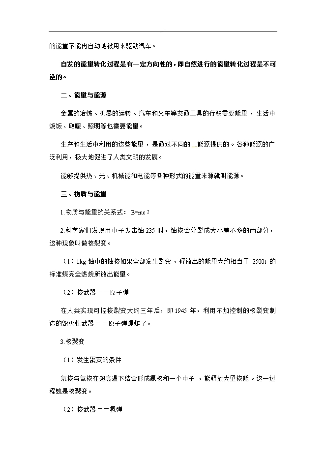 【内容简介】能量既不会凭空消失,也不会凭空产生,它只会从一种形式转化为其他形式,或者从一个物体转移到其他物体,而在转化和转移的过程中,能量的总量保持不变。这就是能量转化与守恒定律。能量转移和能量转化的方向性:1.在热传递的过程中,热量只能自发地从高温物体转移到低温物体,不能相反。如果要使热量从低温物体转移到高温物体,就需要消耗其他形式的能量。例如电冰箱就需要消耗电能。2.汽车制动时,由于摩擦,动能转化成轮胎、地面和空气的内能,这些消耗的能量不能再自动地被用来驱动汽车。自发的能量转化过程是有一定方向性的,即自然进行的能量转化过程是不可逆的。二、能量与能源金属的冶炼、机器的运转、汽车和火车等交通工具的行驶需要能量,生活中烧饭、取暖、照明等也需要能量。生产和生活中利用的这些能量,是通过不同的 能源提供的。各种能源的广泛利用,极大地促进了人类文明的发展。能够提供热、光、机械能和电能等各种形式的能量来源就叫能源。