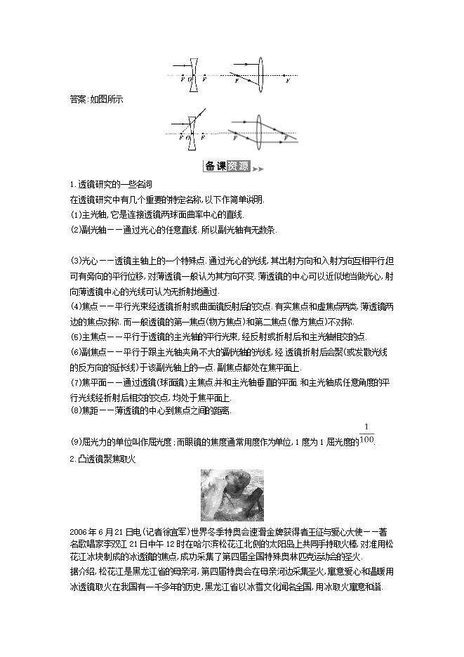 【内容简介】(1)透镜定义:两个面都是 球面 的一部分或一个面是 球面 一部分,另一个面是 平面 的透明体叫作透镜. (2)透镜分类:中间厚、边缘薄的叫作 凸透镜 ;中间薄、边缘厚的叫作 凹透镜 . (3)透镜的主光轴和光心:通过 两个球面球心的直线 C1C2叫作透镜的主光轴,简称主轴;薄透镜的中心O点叫作透镜的 光心 . [来源:学科网]2.透镜对光的作用老师做实验,让学生讨论交流,完成以下填空[来源:学,科,网Z,X,X,K](1)在空气中,平行光束通过凸透镜后,光线向 靠近 主光轴的方向偏折,说明凸透镜对光有 会聚 作用,因此凸透镜叫 会聚透镜 . (2)平行光束通过凹透镜后,光线向 远离 主光轴的方向偏折,说明凹透镜对光有 发散 作用. 因此凹透镜叫 发散透镜 .