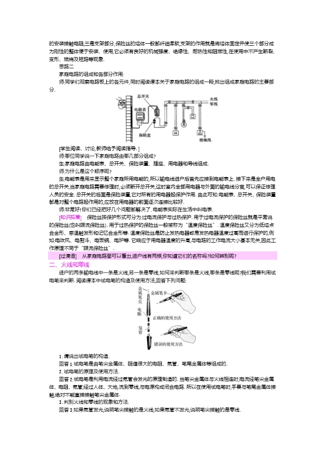 【内容简介】1.家庭电路的总开关和保险装置连接顺序可以颠倒吗?回答1:总开关和保险装置的位置不能换,因为在更换保险装置时可以断开总开关,保护人身安全.2.家庭电路中各用电器间是如何连接的?说出你的判断依据.回答2:家庭电路各用电器间是并联的,因为断开其中一个用电器,其余用电器仍能工作.[知识拓展] 一般保险丝由三个部分组成:一是熔体部分,它是保险丝的核心,熔断时起切断电流的作用,同一类、同一规格保险丝的熔体,材质要相同、几何尺寸要相同、电阻值尽可能小而且要一致,最重要的是熔断特性要一致;二是电极部分,通常有两个,它是熔体与电路连接的重要部件,它必须有良好的导电性,不产生明显的安装接触电阻;三是支架部分,保险丝的熔体一般都纤细柔软,支架的作用就是将熔体固定并使三个部分成为刚性的整体便于安装、使用,它必须有良好的机械强度、绝缘性、耐热性和阻燃性,在使用中不产生断裂、变形、燃烧及短路等现象.思路二家庭电路的组成和各部分作用:师:同学们观察电路板上的各元件,同时阅读课本关于家庭电路的组成一段,找出组成家庭电路的主要部分.