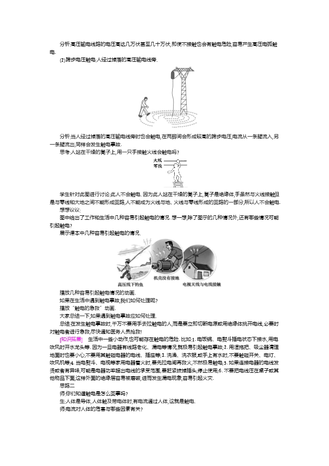 【内容简介】资料:1882年7月26日下午7时,上海的一台发电机开始运转起来,点亮了15盏电灯.这是在中国土地上第一次亮起电灯!可是3个月后,清政府官员竟下令禁止使用电灯.理由是使用电灯不安全,会引起火灾.大家认为这样做合理吗?说说你的看法.教师把学生分成正反两方,展开辩论.辩论完后,让学生说说自己的认识.正方:这样做合理.反方:这样做不合理. [过渡语] 用电虽然有危险,但是它能给我们的生活带来很多好处,利大于弊.生活中只要注意安全用电,就可以避免危险的发生.生活、生产中我们怎样才能防止触电事故的发生呢?学完本节课,你的疑问就会迎刃而解.导入二:情境导入展示生活中常见的用电安全警示标志,比如“高压危险”、“有电危险”等.思考:在哪些地方见到过这些标志? 学生观看用电安全警示标志,说出生活中在哪见过这些标志.播放由电引起的火灾,在高压线下钓鱼触电等视频,说明安全用电的重要性. [过渡语] 电给我们的生活带来便利的同时,使用不当也会造成伤害,怎样才能安全有效地用电呢?这节课我们就来学习安全用电的知识. 一、电压越高越危险阅读教材中“电压越高越危险”,思考下列问题:问题1:电对人体的伤害程度与哪些因素有关?回答1:电对人体造成的伤害程度与通过人体电流的大小及持续时间有关.问题2:结合自己所查资料,说说人对不同电流的不同反应.回答2:人对100~200微安的电流无反应;电流达到1毫安左右会引起麻的感觉;不超过10毫安时,人尚可摆脱电流;超过30毫安时,就会感到剧痛、神经麻痹、呼吸困难,有生命危险;当达到50毫安时,很短时间使人心跳停止.问题3:人手直接接触一节干电池两端,会发生危险吗?........