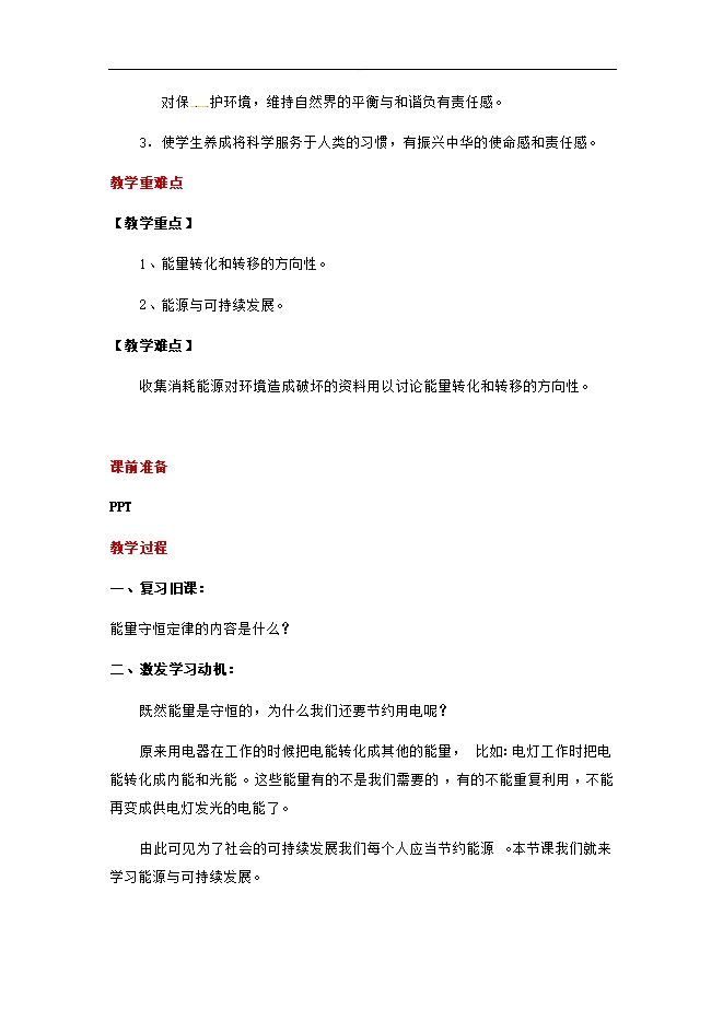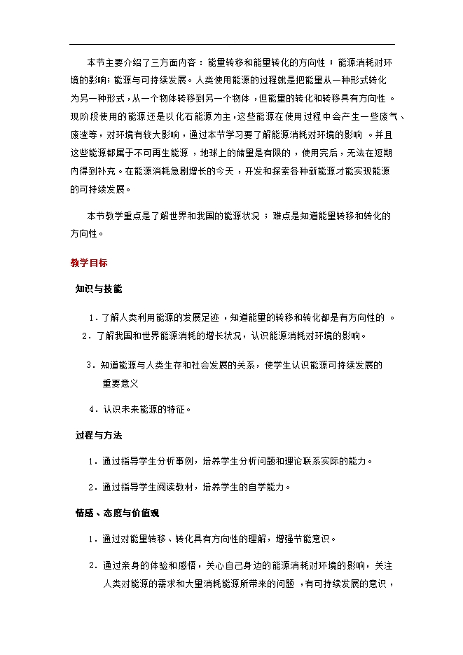 【内容简介】本节主要介绍了三方面内容:能量转移和能量转化的方向性;能源消耗对环境的影响;能源与可持续发展。人类使用能源的过程就是把能量从一种形式转化为另一种形式,从一个物体转移到另一个物体,但能量的转化和转移具有方向性。现阶段使用的能源还是以化石能源为主,这些能源在使用过程中会产生一些废气、废渣等,对环境有较大影响,通过本节学习要了解能源消耗对环境的影响。并且这些能源都属于不可再生能源,地球上的储量是有限的,使用完后,无法在短期内得到补充。在能源消耗急剧增长的今天,开发和探索各种新能源才能实现能源的可持续发展。