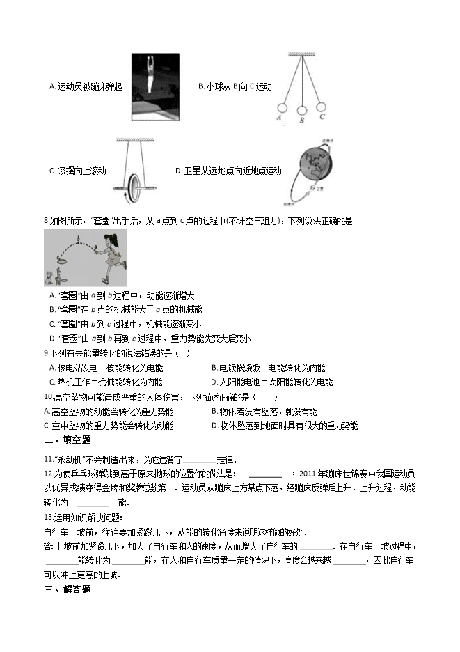 【内容简介】11.“永动机”不会制造出来,为它违背了________ 定律. 12.为使乒乓球弹跳到高于原来抛球的位置你的做法是: ________ ;2011年蹦床世锦赛中我国运动员以优异成绩夺得金牌和奖牌总数第一.运动员从蹦床上方某点下落,经蹦床反弹后上升.上升过程,动能转化为 ________ 能. 13.运用知识解决问题:自行车上坡前,往往要加紧蹬几下,从能的转化角度来说明这样做的好处.答:上坡前加紧蹬几下,加大了自行车和人的速度,从而增大了自行车的 ________.在自行车上坡过程中, ________能转化为 ________能,在人和自行车质量一定的情况下,高度会越来越 ________,因此自行车可以冲上更高的上坡.........