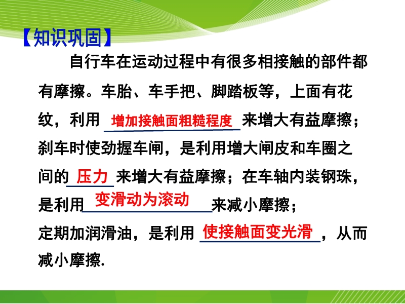 【内容简介】摩擦力的利弊: 1. 摩擦力有利也有弊,我们要增大有利摩擦,减小有害摩擦。 2. 增大有益摩擦的方法: (1)增大物体间的压力 自行车在运动过程中有很多相接触的部件都有摩擦。车胎、车手把、脚踏板等,上面有花纹,利用 来增大有益摩擦;刹车时使劲握车闸,是利用增大闸皮和车圈之间的 来增大有益摩擦;在车轴内装钢珠,是利用 来减小摩擦;定期加润滑油,是利用 ,从而减小摩擦.