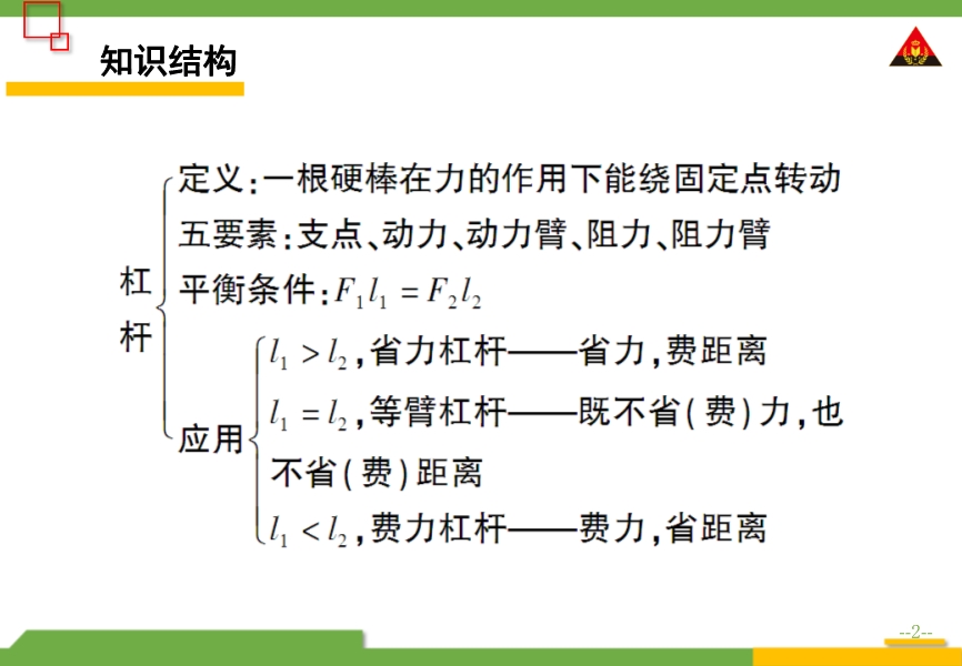 【内容简介】知识点1 杠杆及其平衡条件例题1 小强在探究“杠杆的平衡条件”时:(1)为了便于测量力臂,他先调节杠杆两端的平衡螺母,使杠杆在________位置平衡;(2)下表是小强的实验记录,在这两组数据中,他发现实验序号为________的一组数据是错误的.经检查,结果是测量阻力臂时读错了,阻力臂的实际值应为________m;通过探究,小强得到杠杆的平衡条件是________________.例题4 如图所示,图中是一个______滑轮,如果物体在水平面上做匀速直线运动,拉力F为10N,物体受到的摩擦力大小为_____,若F拉滑轮运动的速度是1m/s,则物体A移动的速度是______.解析:选择滑轮作为研究对象,无论装置怎么改,都是受三个力,且三个力都平衡,作用在轴心上的力等于作用在绳上的力的2倍,F=2 F1=2F2,如图所示,绳子一端移动速度等于物体移动速度的2倍,即v绳=2v物.