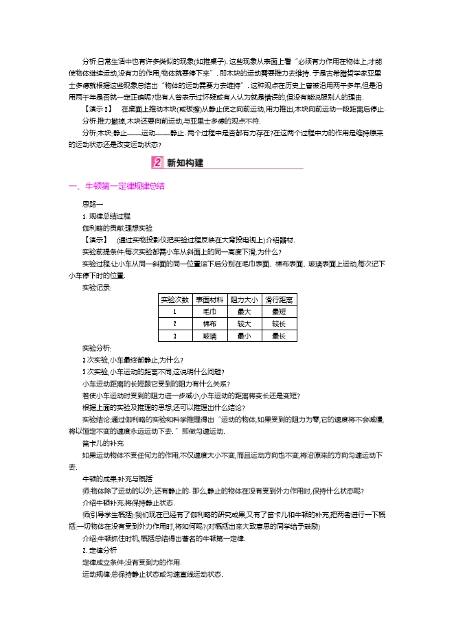 【内容简介】创设游戏,引入课题(撕纸游戏),猜一猜:1.一张纸已剪成两截,但未完全剪断,如果迅速用力撕两边,纸会断成几截?2.现在把纸剪成三截,但未完全剪断,如果迅速用力撕两边,纸会断成几截?大家不要动手,先猜一猜.3.如果在中间的纸下面夹一个夹子,然后迅速用力撕两边,纸会断成几截?请大家想一想:为什么是这样一个结果呢?怎样解释我们的游戏呢?其实,在我们的游戏中还涉及到一个古老的话题——力和运动:用力撕纸,纸条断开,运动起来.运动和力之间到底有什么关系呢?带着这些问题,我们一起来体验古人的探究过程,学习古人的探究方法,进一步理解论述运动和力关系的牛顿第一定律.导入二:演示实验:分别让两个鸡蛋(一生一熟)旋转,再迅速按住,使蛋停下又立即松手,一个不动,另一个却能继续旋转.提问:猜猜看,两个蛋有何不同?设疑:猜想是否正确?为什么两个蛋会出现两种不同的现象?从这节课开始研究与此有关的内容. 导入三:周末,小红和妈妈到杂技厅观看马术表演(如图所示),她看到坐在奔驰骏马上的演员突然腾空而起,惊出一身冷汗,一会儿又看到演员落下来稳稳地坐在马背上,她百思不得其解.你能为小红解释其中的道理吗?.........