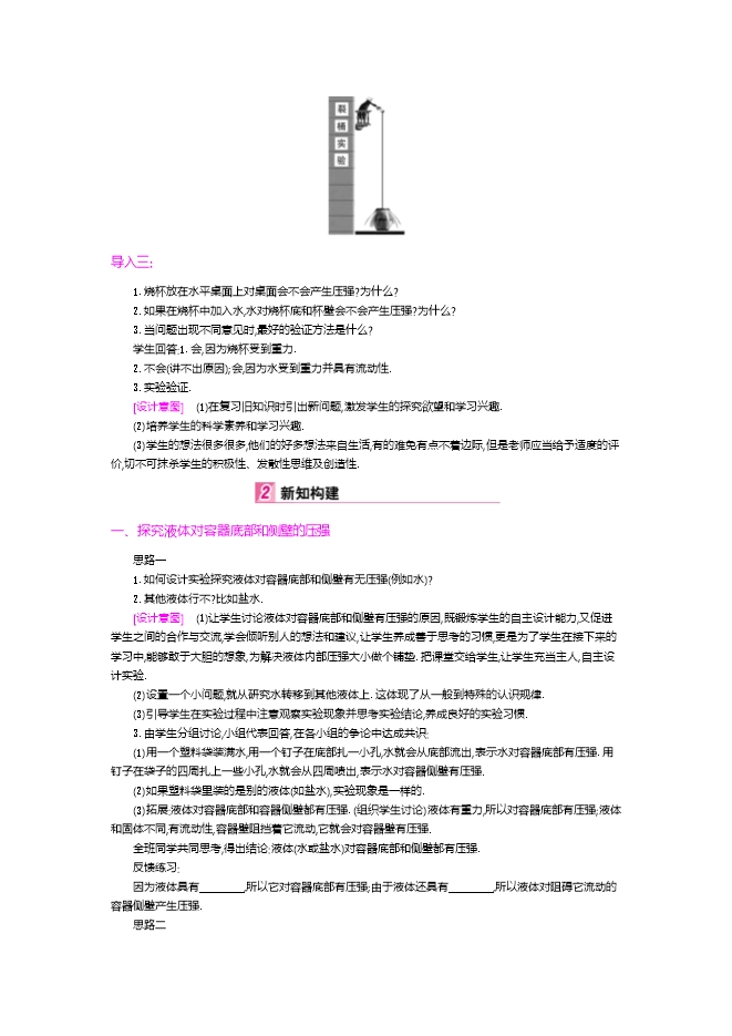 【内容简介】一、探究液体对容器底部和侧壁的压强思路一1.如何设计实验探究液体对容器底部和侧壁有无压强(例如水)?2.其他液体行不?比如盐水.[设计意图] (1)让学生讨论液体对容器底部和侧壁有压强的原因,既锻炼学生的自主设计能力,又促进学生之间的合作与交流,学会倾听别人的想法和建议,让学生养成善于思考的习惯,更是为了学生在接下来的学习中,能够敢于大胆的想象,为解决液体内部压强大小做个铺垫.把课堂交给学生,让学生充当主人,自主设计实验.(2)设置一个小问题,就从研究水转移到其他液体上.这体现了从一般到特殊的认识规律.(3)引导学生在实验过程中注意观察实验现象并思考实验结论,养成良好的实验习惯.3.由学生分组讨论,小组代表回答,在各小组的争论中达成共识:(1)用一个塑料袋装满水,用一个钉子在底部扎一小孔,水就会从底部流出,表示水对容器底部有压强.用钉子在袋子的四周扎上一些小孔,水就会从四周喷出,表示水对容器侧壁有压强.(2)如果塑料袋里装的是别的液体(如盐水),实验现象是一样的.(3)拓展:液体对容器底部和容器侧壁都有压强.(组织学生讨论)液体有重力,所以对容器底部有压强;液体和固体不同,有流动性,容器壁阻挡着它流动,它就会对容器壁有压强.全班同学共同思考,得出结论:液体(水或盐水)对容器底部和侧壁都有压强.反馈练习:因为液体具有 ,所以它对容器底部有压强;由于液体还具有 ,所以液体对阻碍它流动的容器侧壁产生压强.