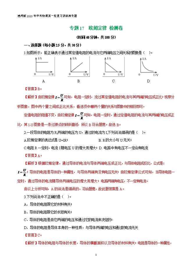 通用版2020年中考物理第一轮复习讲练测专题:17.欧姆定律(4份资料)