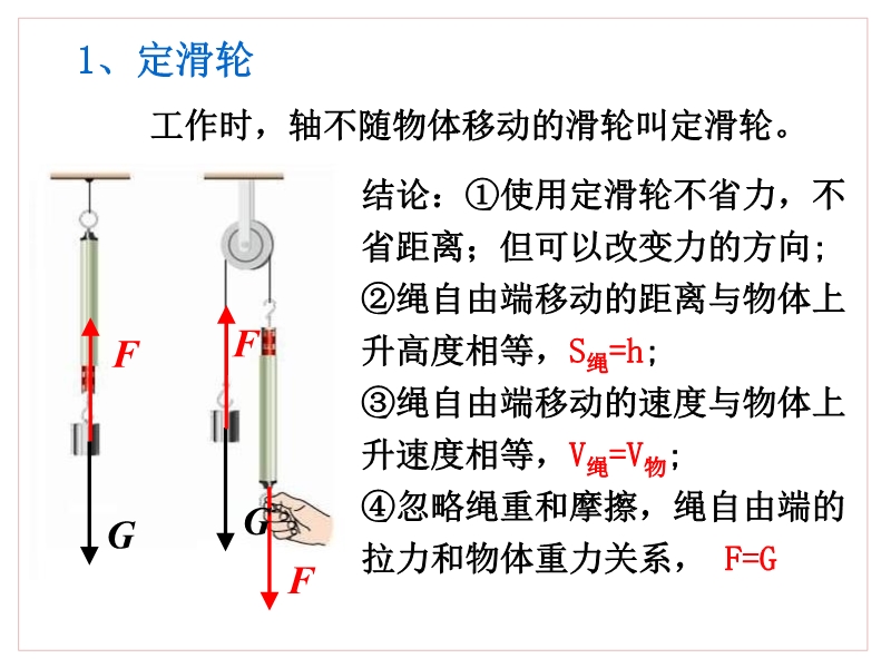 【内容简介】1、定滑轮工作时,轴不随物体移动的滑轮叫定滑轮。结论:①使用定滑轮不省力,不省距离;但可以改变力的方向;②绳自由端移动的距离与物体上升高度相等,S绳=h;③绳自由端移动的速度与物体上升速度相等,V绳=V物;④忽略绳重和摩擦,绳自由端的拉力和物体重力关系, F=G工作时,轴随着物体移动的滑轮叫动滑轮。