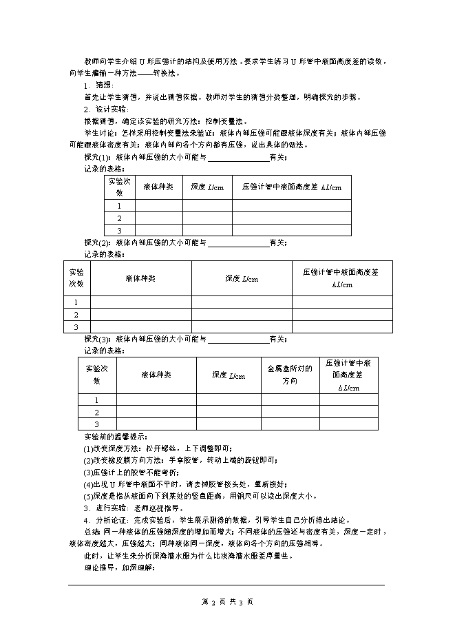 【内容简介】哪些同学有过游泳的经历呢?同学们积极发言,都说游到深处比浅处胸口更闷。再用课件展示浅海潜水服、深海潜水服,并问:为什么深海潜水服要比浅海潜水服更厚重些?要揭开这层神秘的面纱,今天我们就来学习液体的压强。 二、新课教学探究点一:探究液体内部压强的特点活动1:多媒体展示帕斯卡实验,感受液体压强的存在。活动2:学生实验,感受液体压强的存在并分析液体压强存在的原因。桌子上的器材:底部扎有橡皮膜的瓶子,空饮料瓶和锥子,塑料袋,盛有水的水槽。设计一个实验具体感受一下液体压强的存在,并注意观察液体压强有哪些特点。教师:请大家展示一下你们的实验,你们怎么做的?观察到什么现象?液体内部压强有哪些特点?教师:下面谁能给大家总结一下,刚才我们得出的结论,液体在什么地方有压强?分析论证:液体对容器底和侧壁都有压强。教师:为什么液体对容器底有压强?为什么液体对容器侧壁有压强?学生总结:液体由于受到重力,所以对容器底有压强,液体由于具有流动性,所以对容器侧壁有压强。