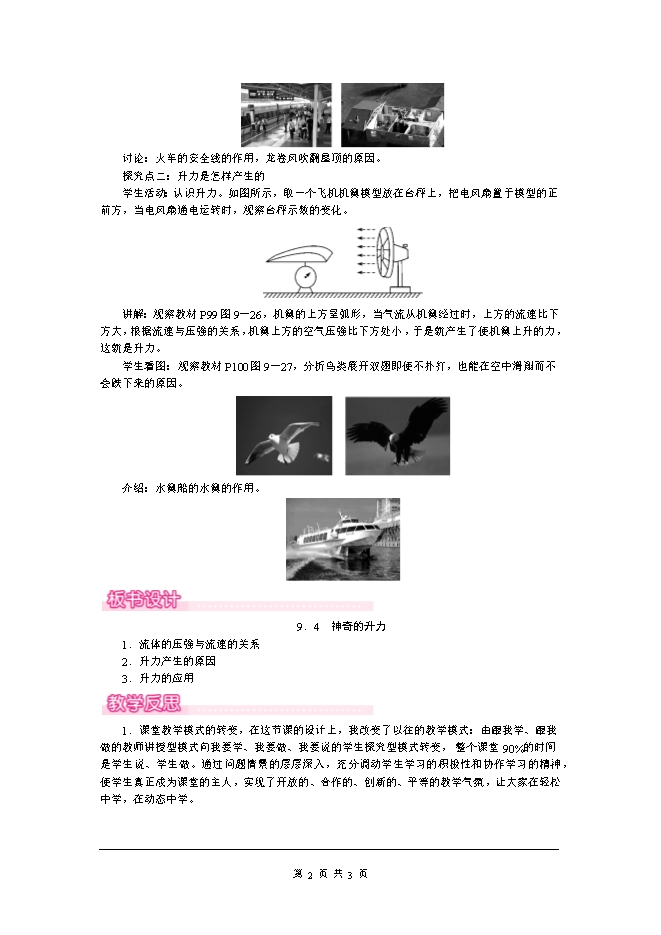 【内容简介】今天,我们先请四位同学来进行两项比赛:项目一:硬币“跳高”比赛。 教师提问:是什么力使得硬币向上“跳”起来呢?项目二:“漏斗吹球”比赛。(比赛规则:用手掌托着乒乓球,把乒乓球放在翻转的漏斗中,然后用嘴通过漏斗向下吹气,此时松开手。看到了什么现象?) 教师提问:乒乓球为什么在漏斗下方不会掉下来呢?教师讲述:让我们带着问题一起走进今天的物理课堂。二、新课教学探究点一:流体的压强与流速的关系讲述:水、空气等都具有流动性,它们统称为流体。流体运动时,在流速不同的地方会表现出一种奇妙的特性。学生活动:A.倔强的纸片;B.不听话的乒乓球;C.做个简易喷雾器。学生感受流体压强和流速的关系,提醒学生从对比流速和对比压强两个方面进行分析、比较并尝试解释这些现象。教师总结:流速大的地方,压强小;流速小的地方,压强大。多媒体展示:火车的安全线,龙卷风吹翻屋顶。 讨论:火车的安全线的作用,龙卷风吹翻屋顶的原因。探究点二:升力是怎样产生的学生活动:认识升力。如图所示,取一个飞机机翼模型放在台秤上,把电风扇置于模型的正前方,当电风扇通电运转时,观察台秤示数的变化。 讲解:观察教材P99图9-26,机翼的上方呈弧形,当气流从机翼经过时,上方的流速比下方大,根据流速与压强的关系,机翼上方的空气压强比下方处小,于是就产生了使机翼上升的力,这就是升力。学生看图:观察教材P100图9-27,分析鸟类展开双翅即使不扑打,也能在空中滑翔而不会跌下来的原因。