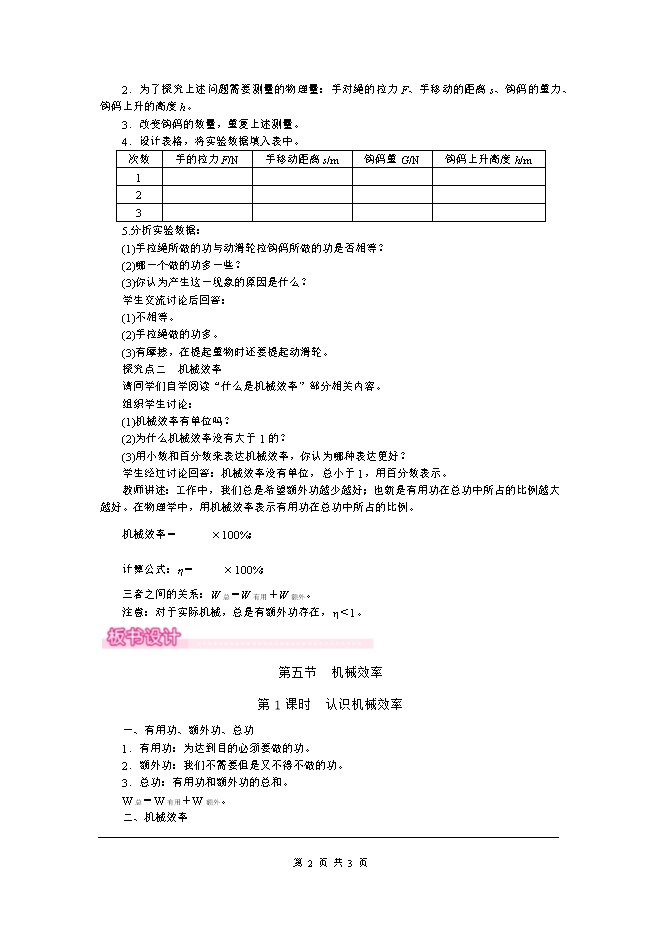 【内容简介】探究点一 有用功、额外功和总功1.结合用动滑轮提升沙子,请同学们观看提沙子过程的视频。思考:(1)在把沙子从一楼运上三楼的过程中,每种方法中各对哪些物体做了功?(2)无论他采取哪种方法都必须做的功是他对什么做的功?(3)在几种不同的方法中他不愿做但又不得不做的功分别是什么?总结:一般来说,机械对外所做的功为有用功,机械克服自身部件的重力和摩擦力所做的功为额外功,动力对机械所做的功为总功。总功等于有用功与额外功之和。指出:前面实验中,第三种方法最好,因为第三种方法做的额外功最少,总功最少。讨论:不使用机械直接提升物体做的功,与使用机械提升物体做的功一样吗?(手拉绳做的功与动滑轮对沙子做的功相等吗?)怎样探究这个问题?1.设计实验方案:用手通过一只弹簧测力计拉一个动滑轮,沿竖直方向匀速缓慢提起重为G的钩码。2.为了探究上述问题需要测量的物理量:手对绳的拉力F、手移动的距离s、钩码的重力、钩码上升的高度h。3.改变钩码的数量,重复上述测量。