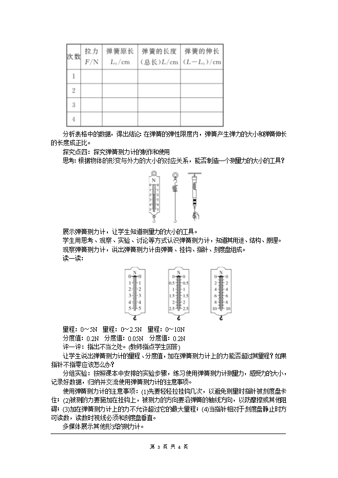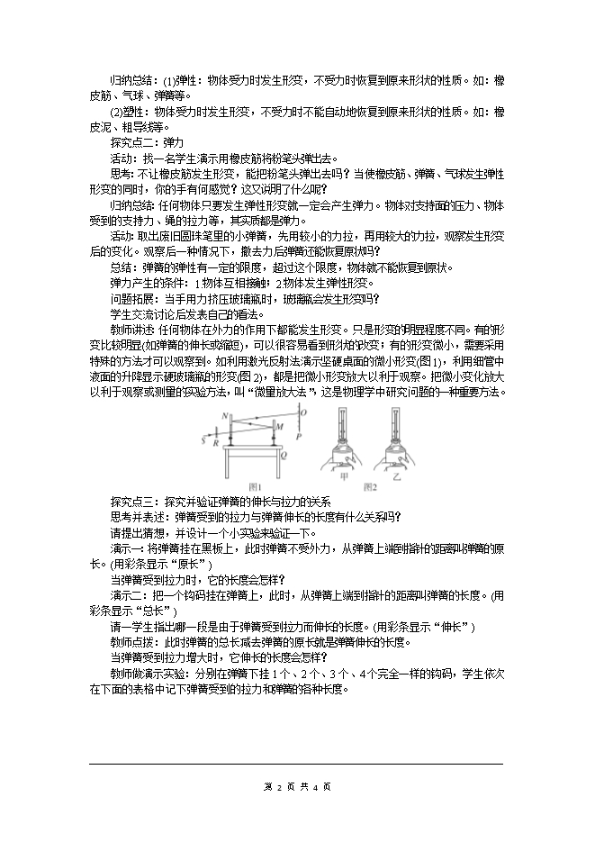 【内容简介】探究点一:弹性与塑性1.活动:小组为单位利用手中的器材进行实验。实验1.用力压尺子,体会尺子对手的作用力,松手后,观察尺子的变化。实验2.用力拉橡皮筋,体会橡皮筋对手的作用力,松手后,观察橡皮筋的变化。实验3.用力捏橡皮泥,有何感觉?松手后,有何变化?用力握白纸呢?问题:什么样的物体,在挤压时,会明显地感觉它对我们的手有作用力?2.学生先动手实验,探究完毕,学生间进行交流,互相解决问题,将不能解决的共同性问题提出来,师生共同讨论最后得出结论。让学生通过亲身体验,观察并分析弹性和塑性的区别。演示实验:用力拉弹簧,弹簧会伸长,松手后,弹簧可恢复到原来的长度;粗导线用力掰弯,松手后不能恢复原状。归纳总结:(1)弹性:物体受力时发生形变,不受力时恢复到原来形状的性质。如:橡皮筋、气球、弹簧等。(2)塑性:物体受力时发生形变,不受力时不能自动地恢复到原来形状的性质。如:橡皮泥、粗导线等。探究点二:弹力活动:找一名学生演示用橡皮筋将粉笔头弹出去。思考:不让橡皮筋发生形变,能把粉笔头弹出去吗?当使橡皮筋、弹簧、气球发生弹性形变的同时,你的手有何感觉?这又说明了什么呢?归纳总结:任何物体只要发生弹性形变就一定会产生弹力。物体对支持面的压力、物体受到的支持力、绳的拉力等,其实质都是弹力。活动:取出废旧圆珠笔里的小弹簧,先用较小的力拉,再用较大的力拉,观察发生形变后的变化。观察后一种情况下,撤去力后弹簧还能恢复原状吗?.........