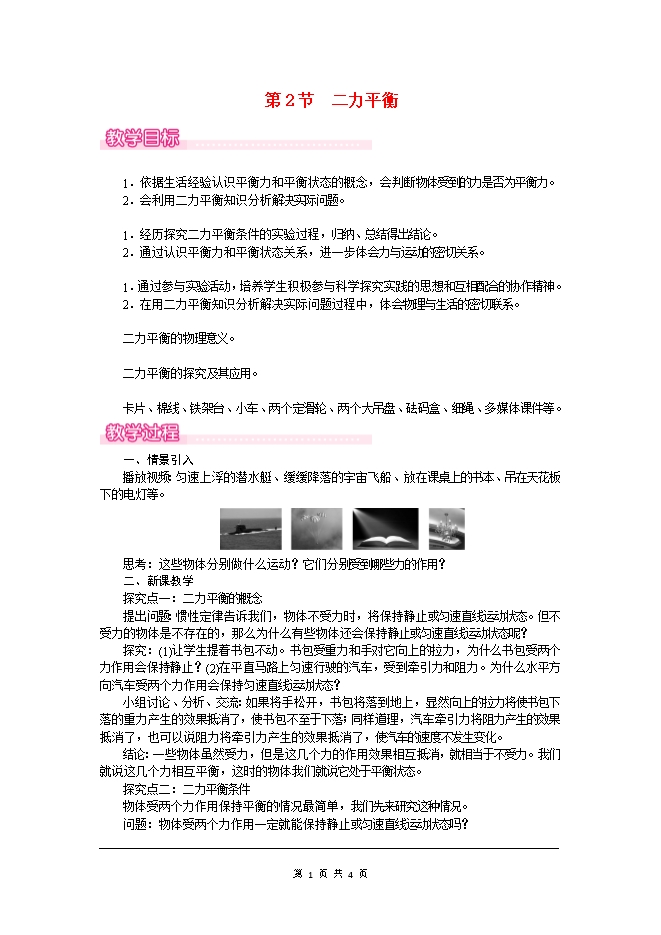 【内容简介】播放视频:匀速上浮的潜水艇、缓缓降落的宇宙飞船、放在课桌上的书本、吊在天花板下的电灯等。 思考:这些物体分别做什么运动?它们分别受到哪些力的作用?二、新课教学探究点一:二力平衡的概念提出问题:惯性定律告诉我们,物体不受力时,将保持静止或匀速直线运动状态。但不受力的物体是不存在的,那么为什么有些物体还会保持静止或匀速直线运动状态呢?探究:(1)让学生提着书包不动。书包受重力和手对它向上的拉力,为什么书包受两个力作用会保持静止?(2)在平直马路上匀速行驶的汽车,受到牵引力和阻力。为什么水平方向汽车受两个力作用会保持匀速直线运动状态?小组讨论、分析、交流:如果将手松开,书包将落到地上,显然向上的拉力将使书包下落的重力产生的效果抵消了,使书包不至于下落;同样道理,汽车牵引力将阻力产生的效果抵消了,也可以说阻力将牵引力产生的效果抵消了,使汽车的速度不发生变化。结论:一些物体虽然受力,但是这几个力的作用效果相互抵消,就相当于不受力。我们就说这几个力相互平衡,这时的物体我们就说它处于平衡状态。探究点二:二力平衡条件物体受两个力作用保持平衡的情况最简单,我们先来研究这种情况。问题:物体受两个力作用一定就能保持静止或匀速直线运动状态吗?举例:放在光滑斜面上的书,受重力和斜面的支持力但要沿斜面下滑;电梯受重力和向上的拉力,起动后,速度越来越快。问题:如果作用在物体上的力只有两个,且物体处于平衡状态,这两个力应该满足什么样的条件呢?学生讨论说出自己的见解。.........