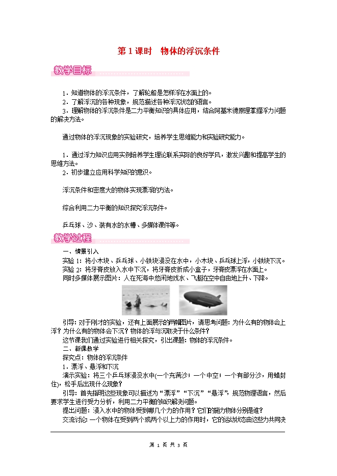 下载地址1|ja/2020/3/20203147374.docx<p>实验1:将小木块、乒乓球、小铁块浸没在水中,小木块、乒乓球上浮,小铁块下沉。</p><p>实验2:将牙膏皮放入水中下沉,将牙膏皮折成小盒子,牙膏皮漂浮在水面上。</p><p>同时多媒体展示图片:人在死海中悠闲地戏水、飞艇在空中自由地上升、下降。</p><p> </p><p>引导:对于刚才的实验,还有上面展示的两幅图片,请思考问题:为什么有的物体会上浮?为什么有的物体会下沉?物体的浮与沉取决于什么条件?</p><p>这节课我们通过实验进行相关探究,引出课题:物体的浮沉条件。</p><p>二、新课教学</p><p>探究点:物体的浮沉条件</p><p>1.漂浮、悬浮和下沉</p><p>演示实验:将三个乒乓球浸没水中(一个充满沙;一个中空;一个有部分沙,用蜡封住),松手后出现什么现象?</p><p>引导:首先指明这些现象可以描述为“漂浮”“下沉”“悬浮”,规范物理语言,然后要求学生进行受力分析,利用二力平衡的知识解决问题。</p><p>提出问题:浸入水中的物体受到哪几个力的作用?它们的施力物体分别是谁?</p><p>交流讨论:一个物体在受到两个或两个以上力的作用时,它的运动状态由这些力共同决定。</p><p>(1)F浮=G时,它受到平衡力的作用,将处于什么状态?</p><p>(2)F浮>G时,它受到非平衡力的作用,将处于什么状态?</p><p>(3)F浮<G时,它受到非平衡力的作用,将处于什么状态?</p><p>思考问题:下沉的物体最终处于什么状态?为什么?那么上浮的物体最终又处于什么状态?</p><p>2.物体的浮沉条件</p><p><br /></p>人教版不限教案专供vip会员docx
